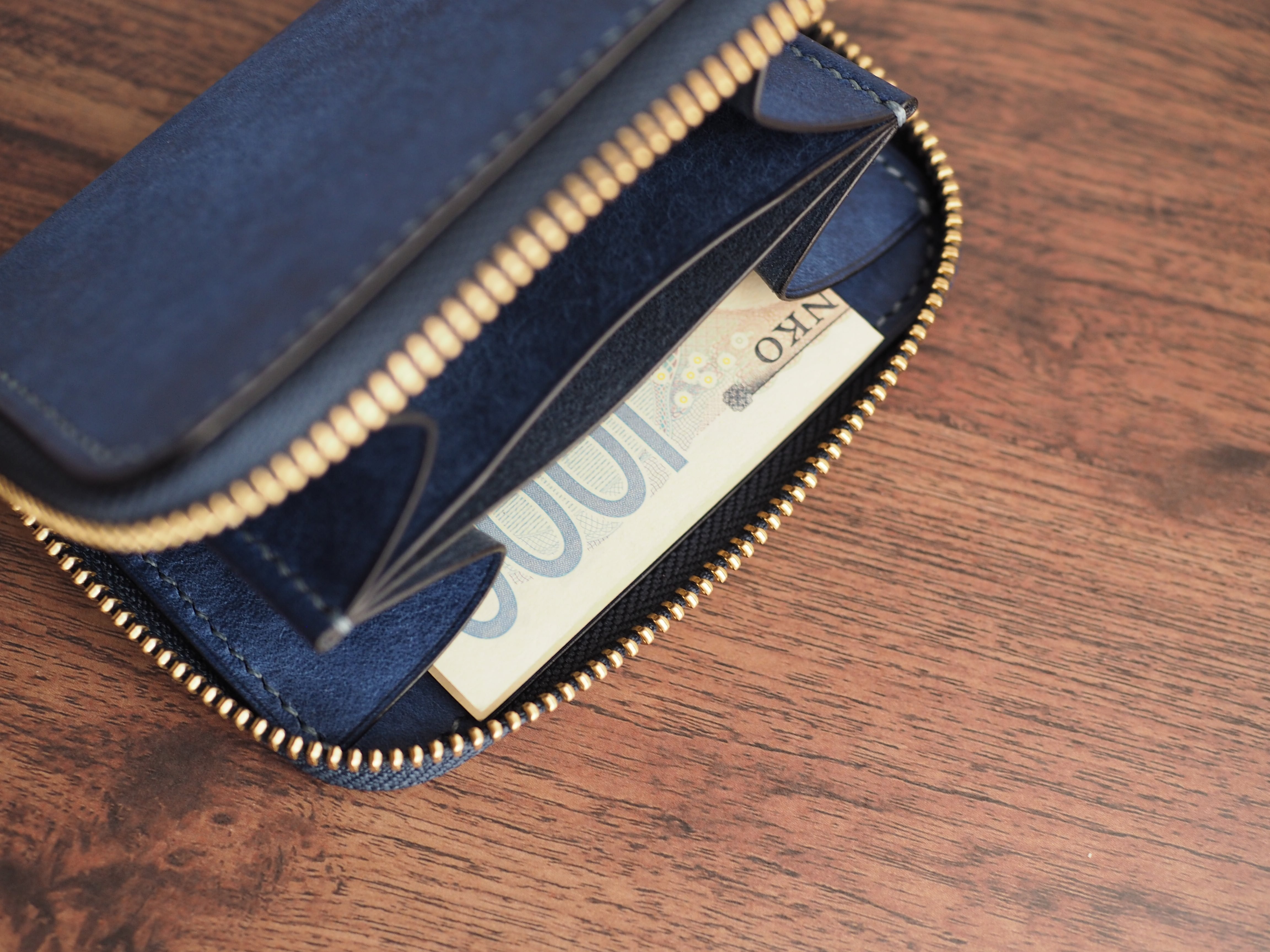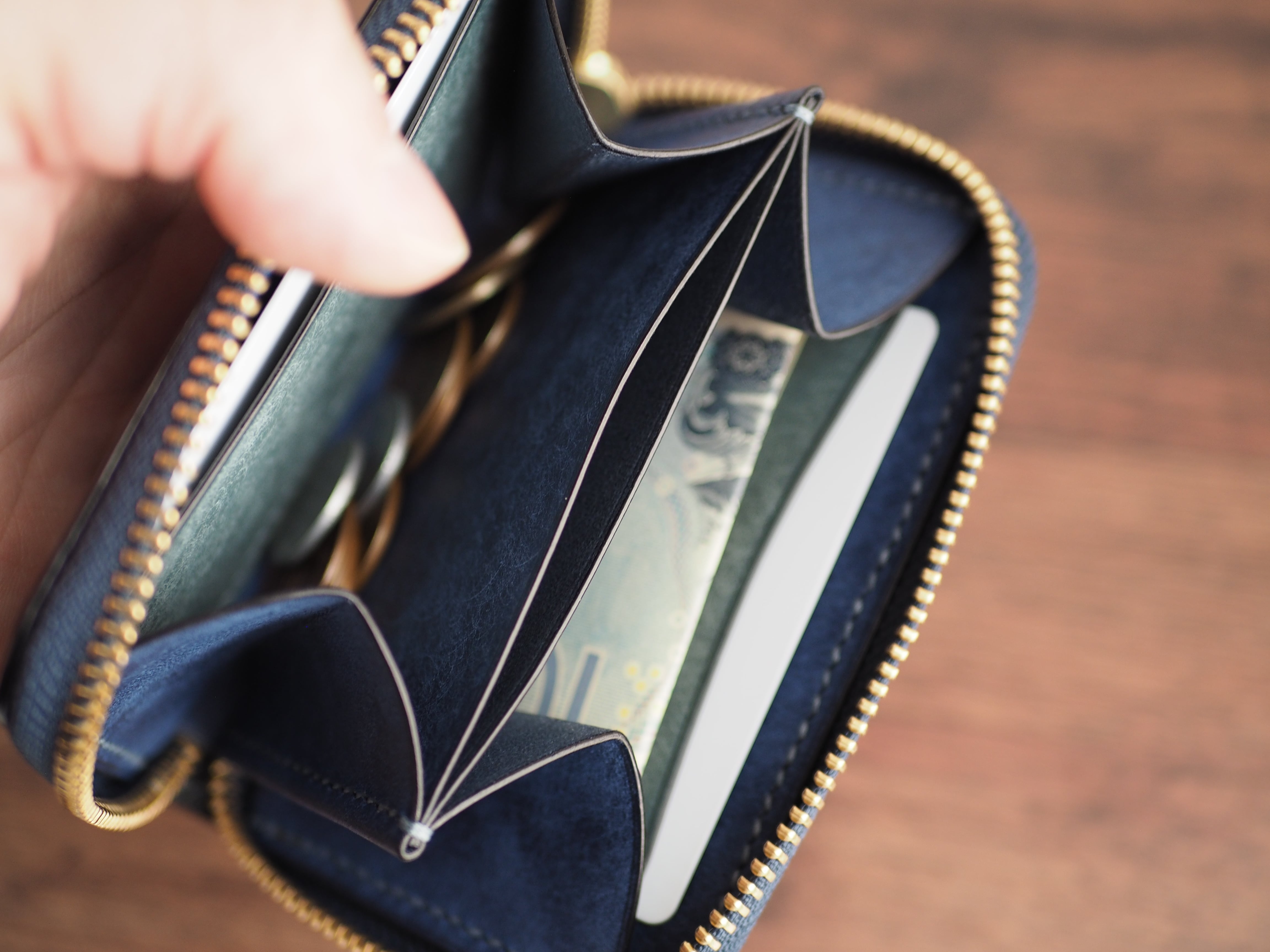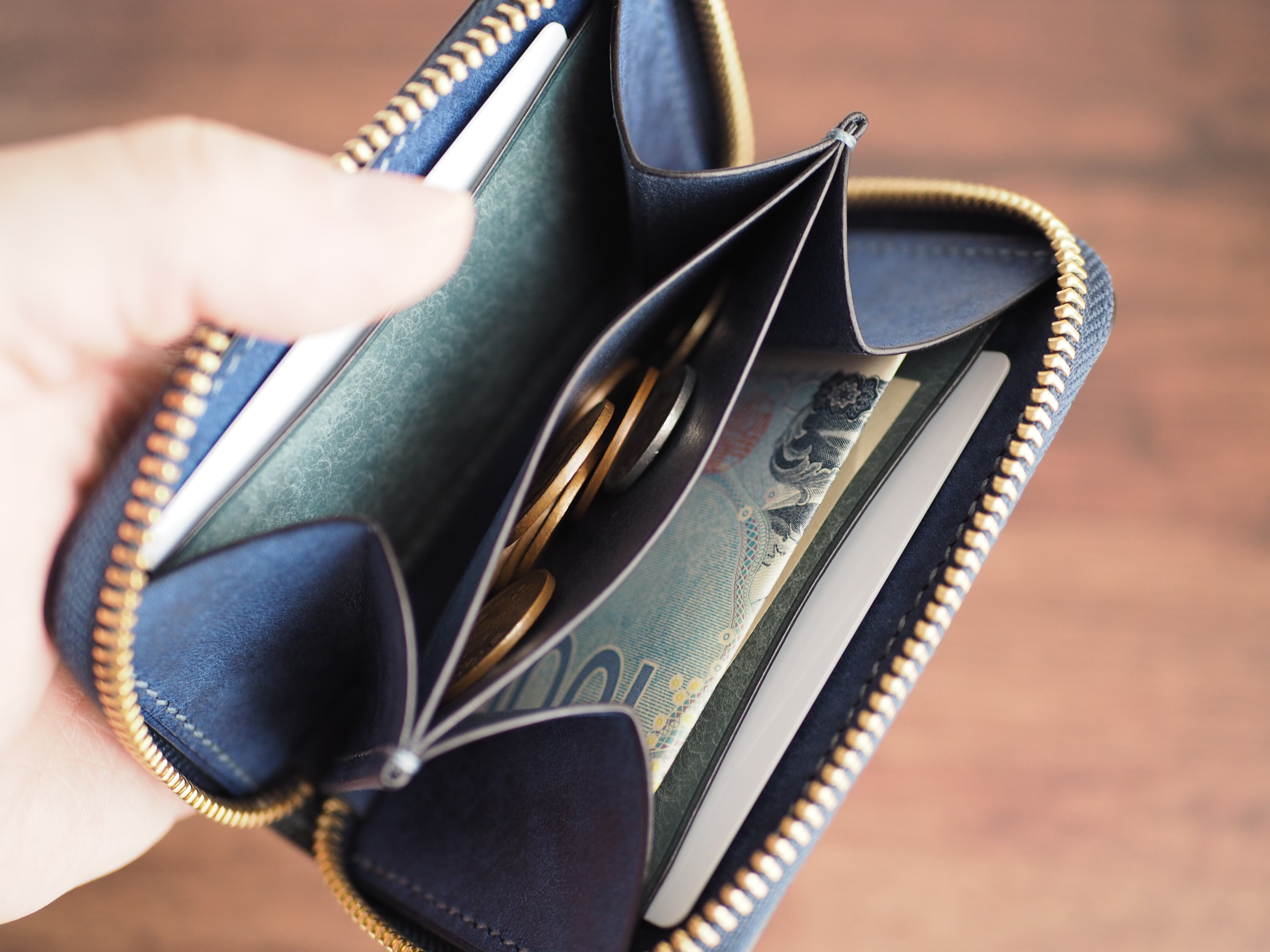 お札の収納: 基本は三つ折りで収納となります。二つ折りにした場合は、数枚程度ならば収納可能です(入れすぎるとファスナー開閉時に金具に干渉する可能性がございます)。