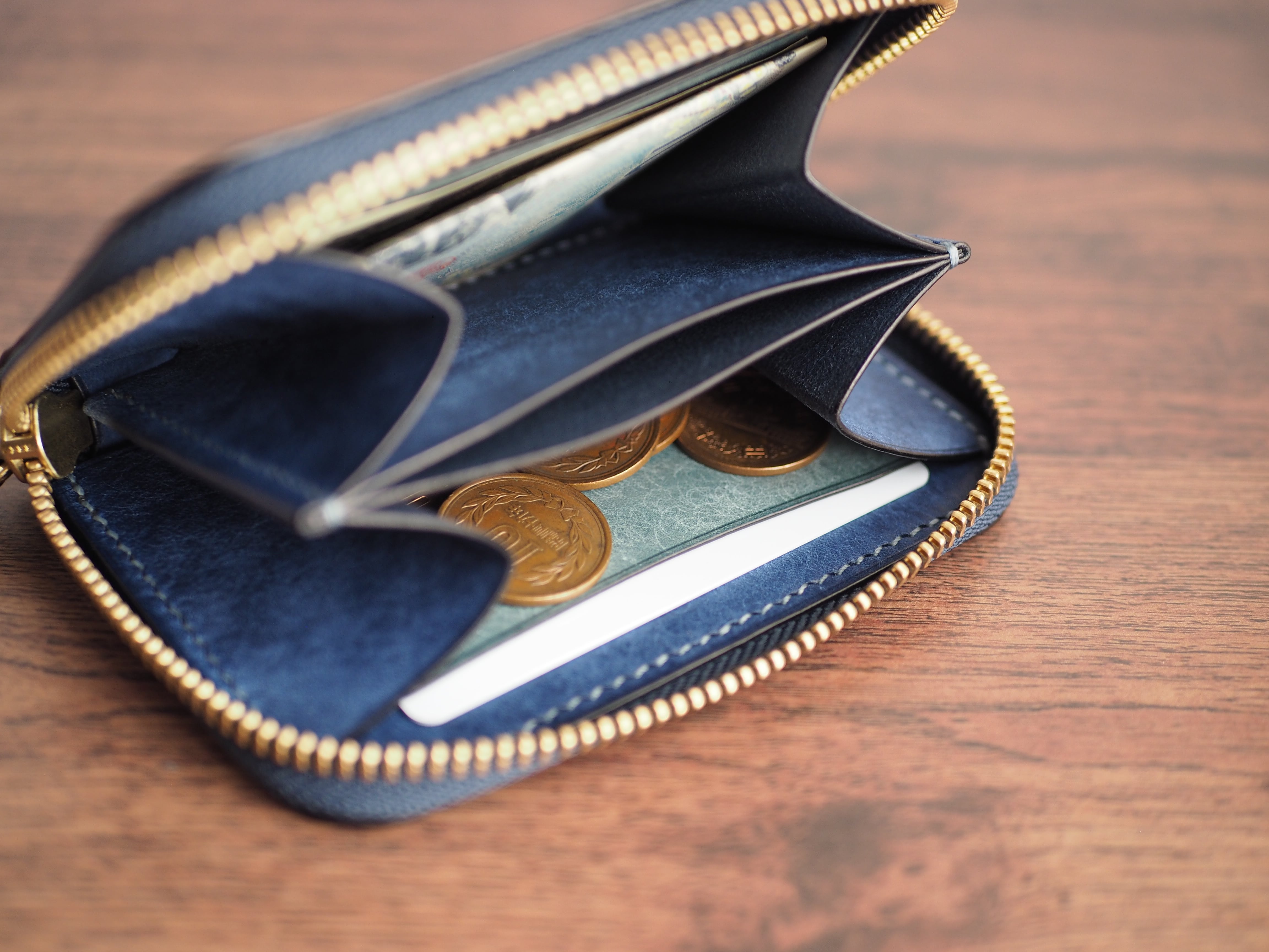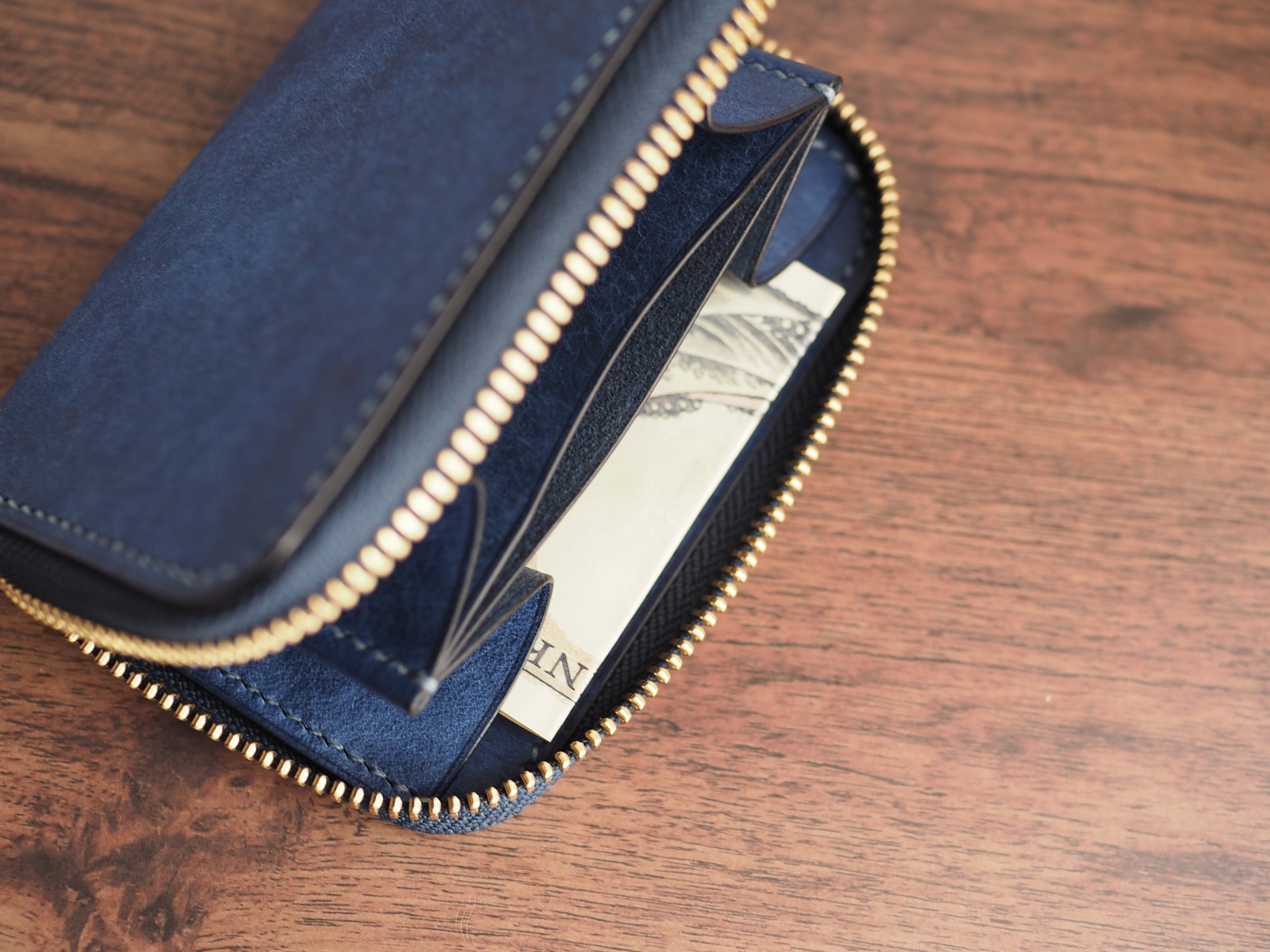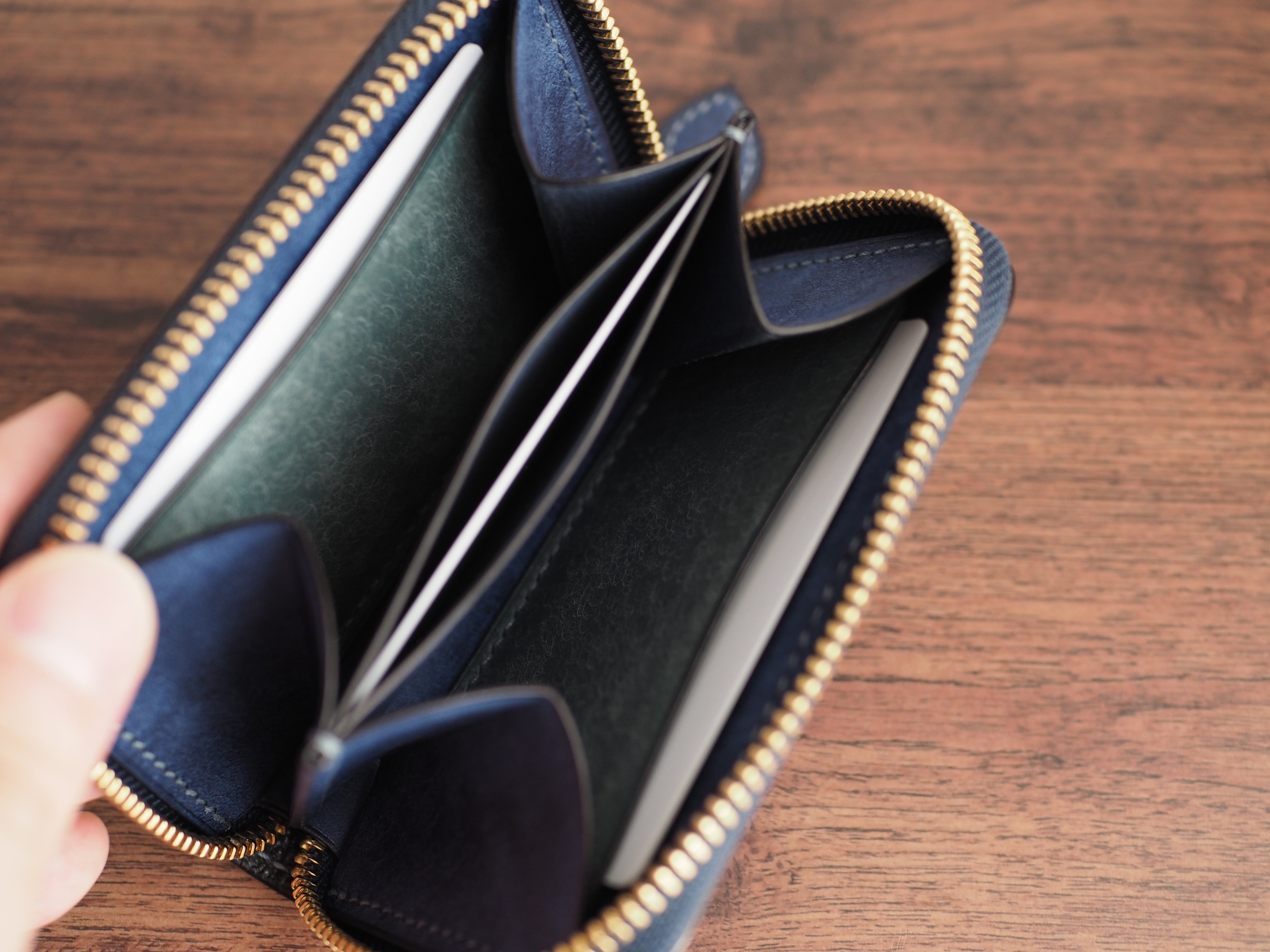 お札の収納: 基本は三つ折りで収納となります。二つ折りにした場合は、数枚程度ならば収納可能です(入れすぎるとファスナー開閉時に金具に干渉する可能性がございます)。