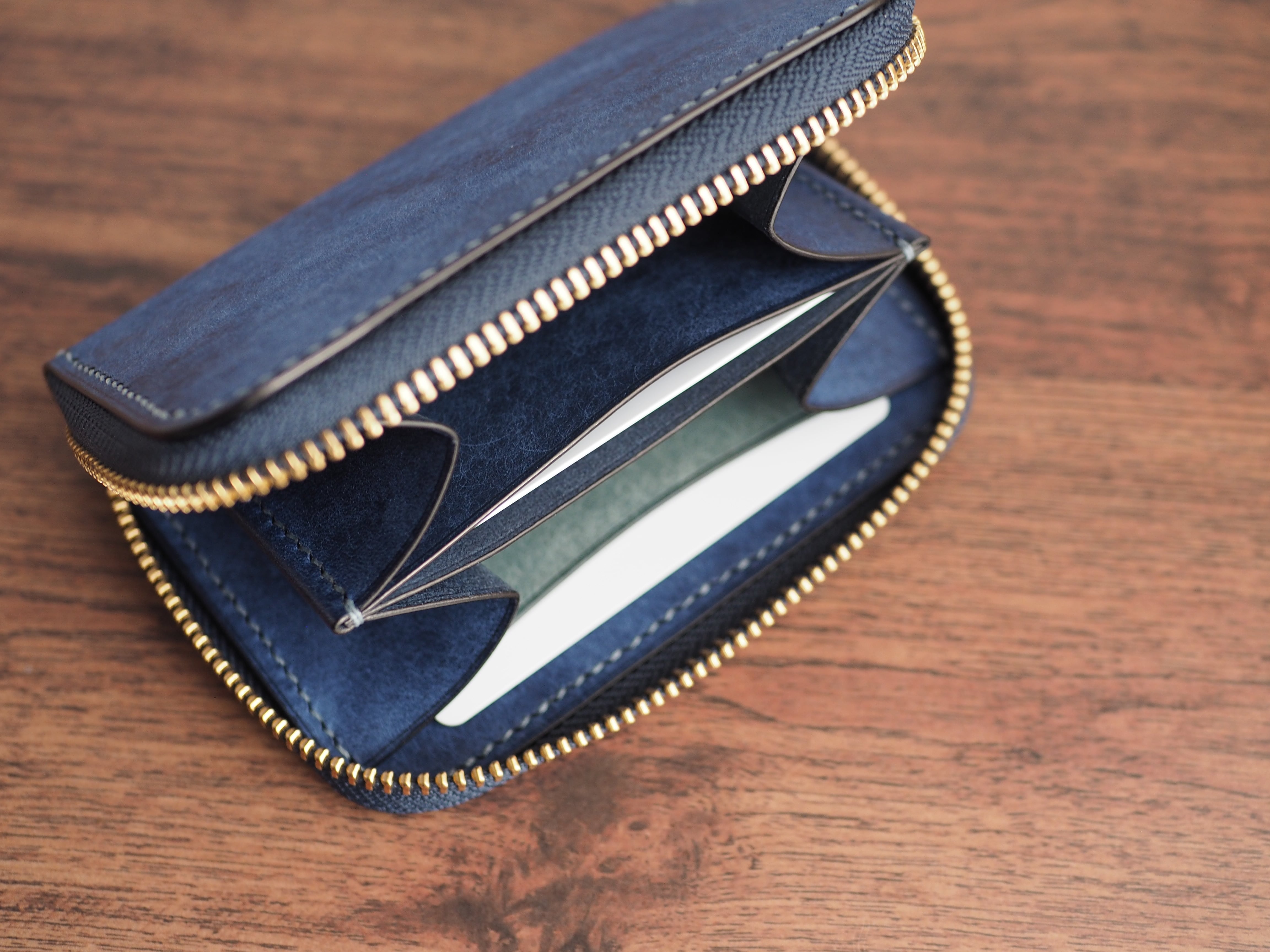 ご覧いただきありがとうございます。こちらは、イタリアンレザーマルゴーのコバルトをメインに、カードポケットの一部にアヴィオを使用。全工程を手縫いで丁寧に製作したラウンドファスナーミニウォレットです。鮮やかなバイカラーの中に、本革ならではの劇的なエイジングと作り手のこだわりを凝縮しました。