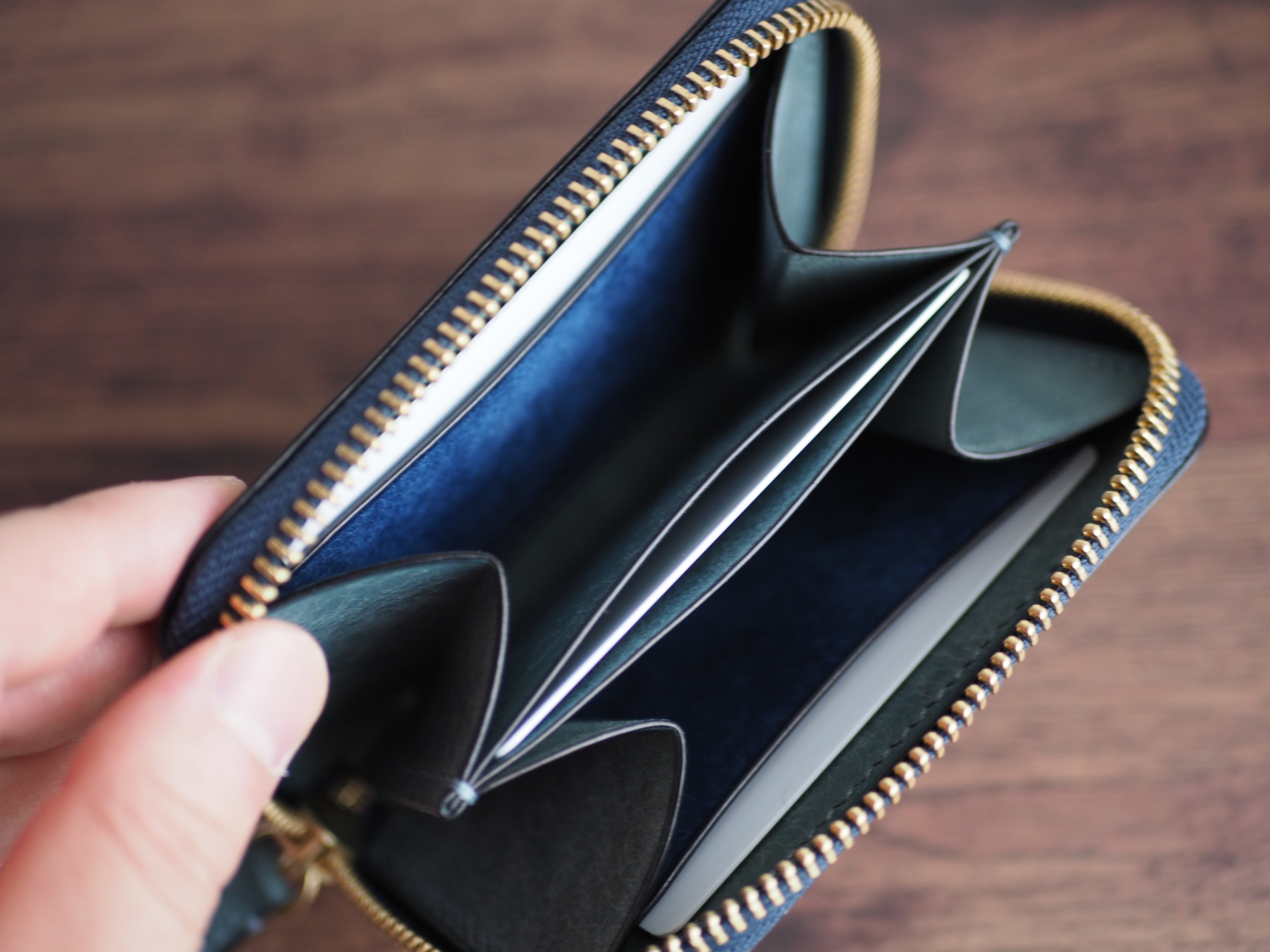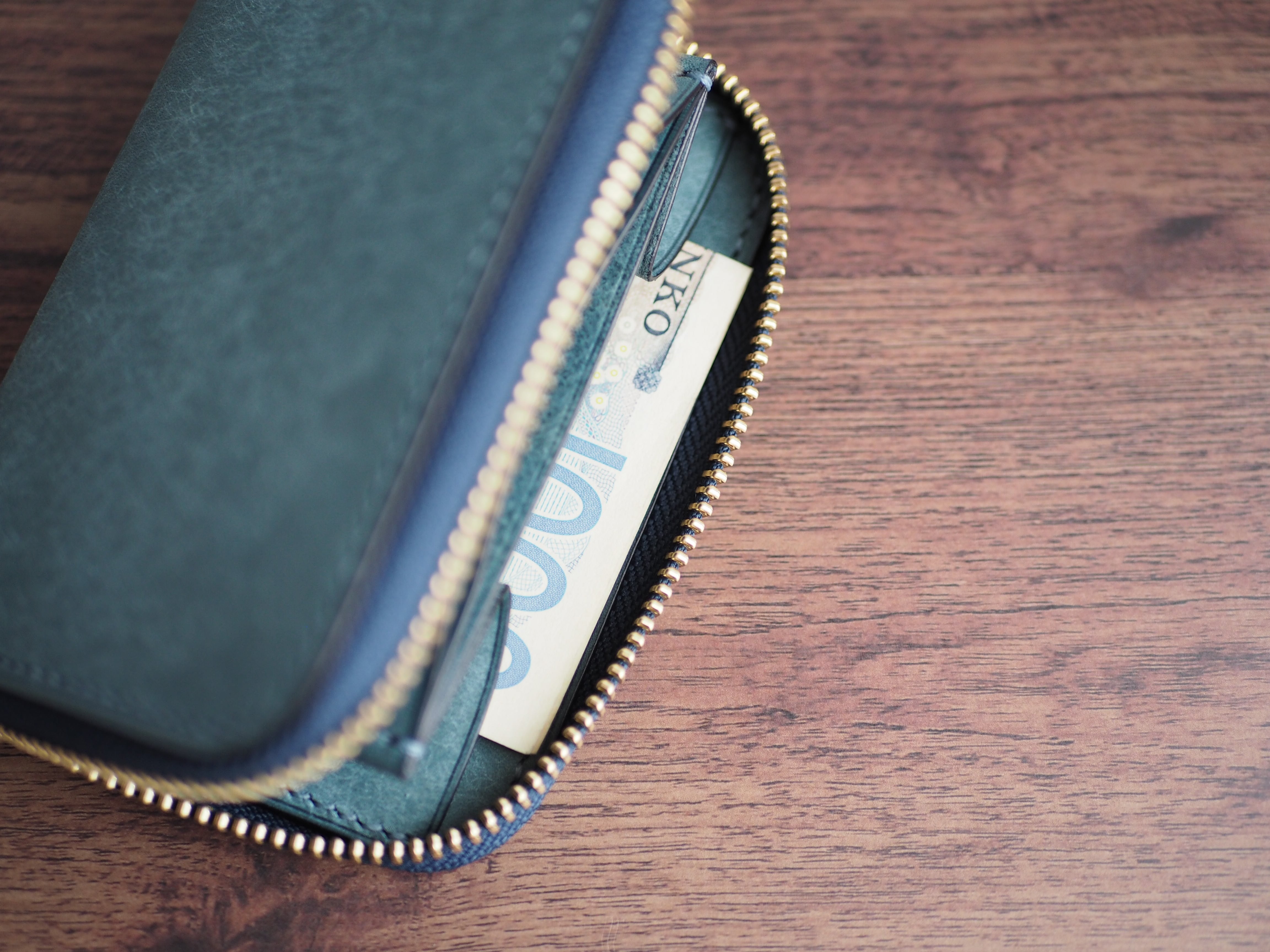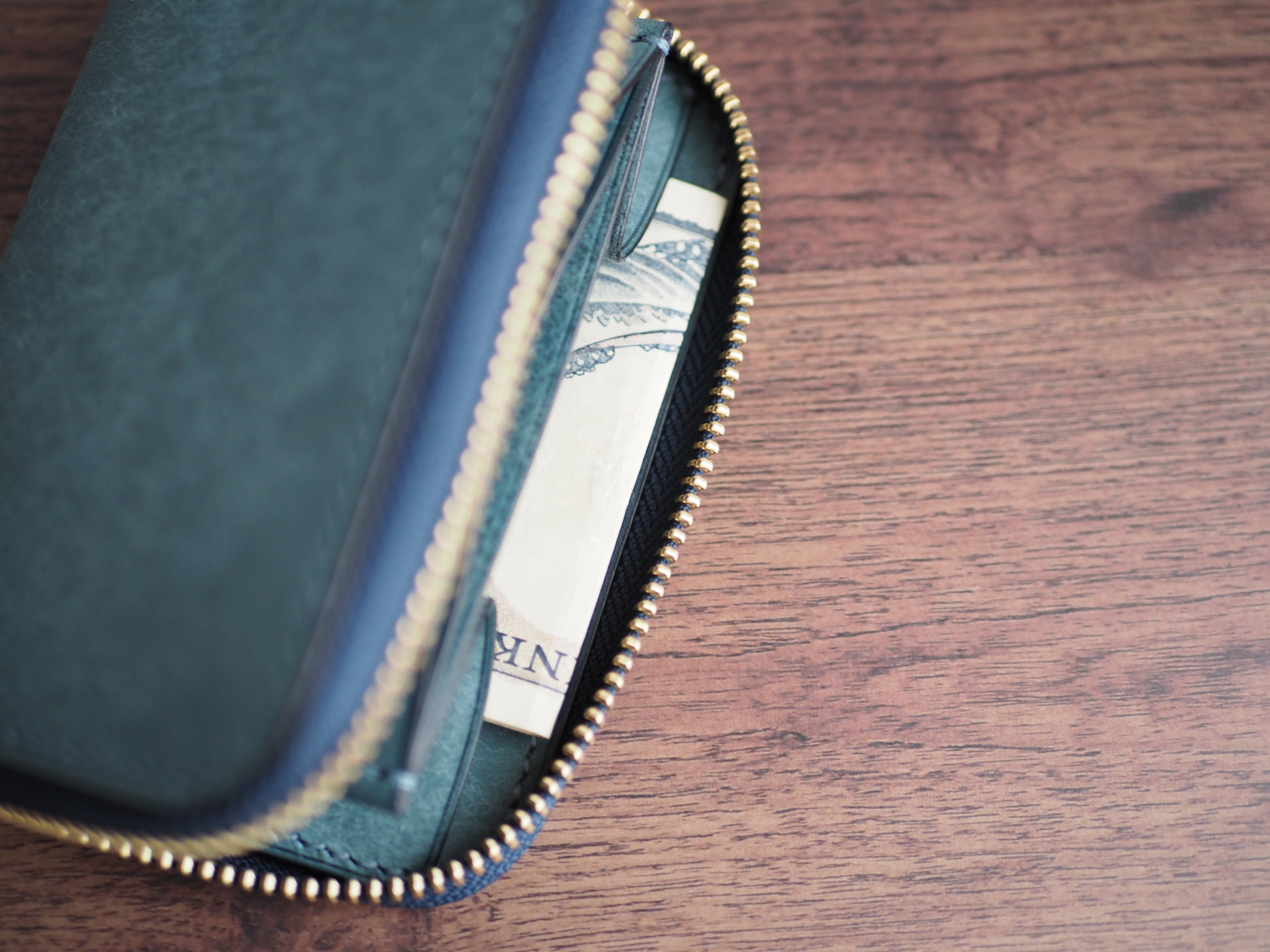 お札の収納: 基本は三つ折りで収納となります。二つ折りにした場合は、数枚程度ならば収納可能です(入れすぎるとファスナー開閉時に金具に干渉する可能性がございます)。