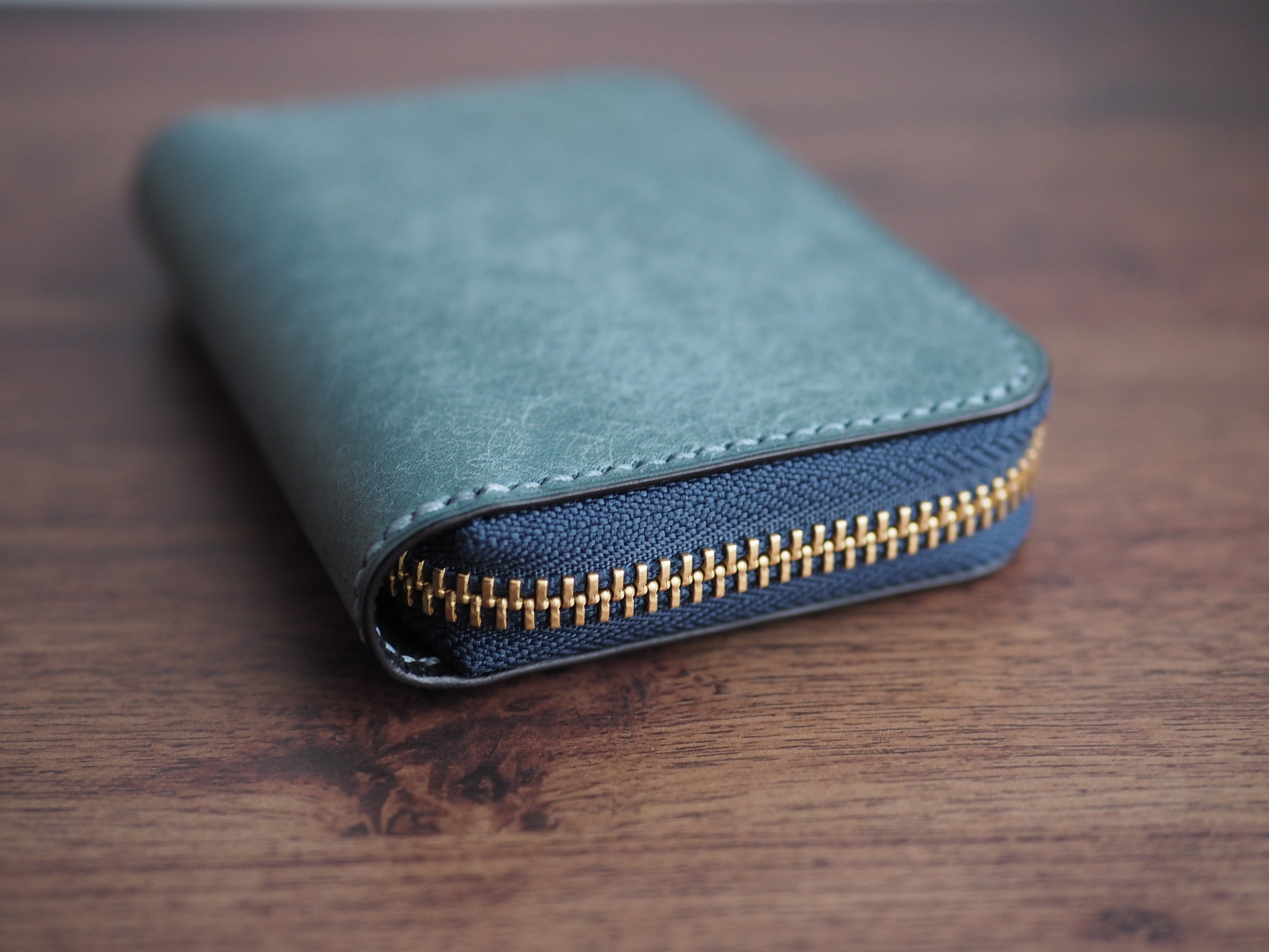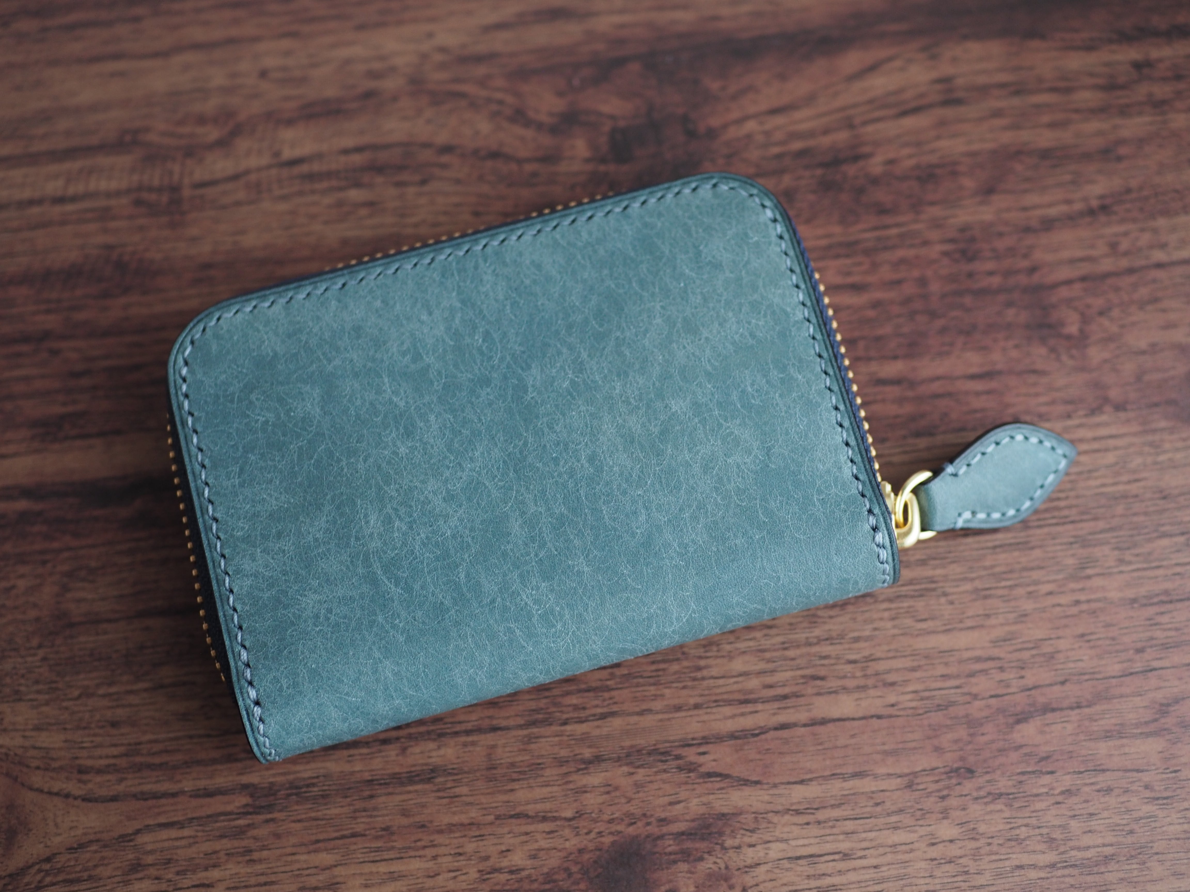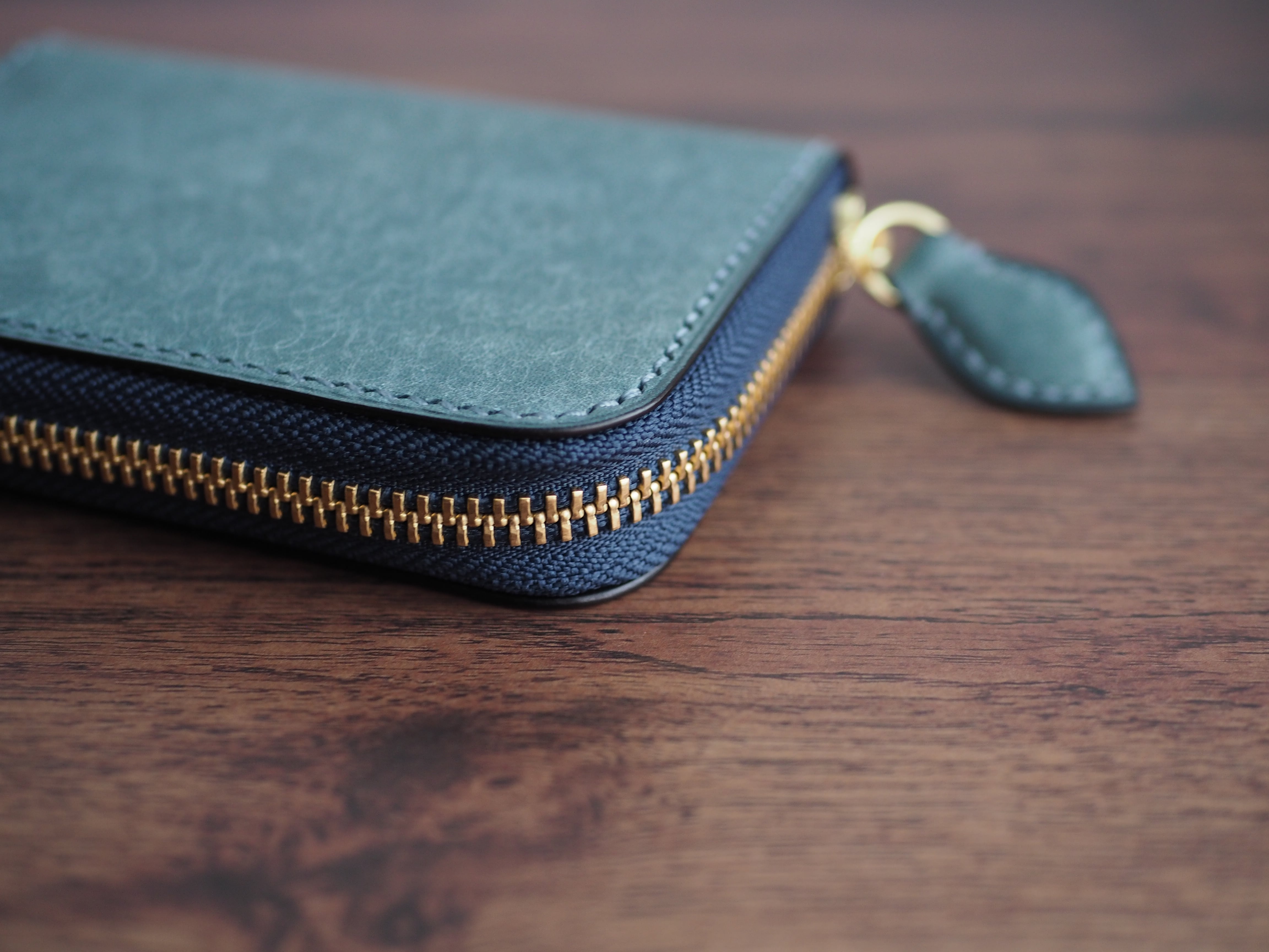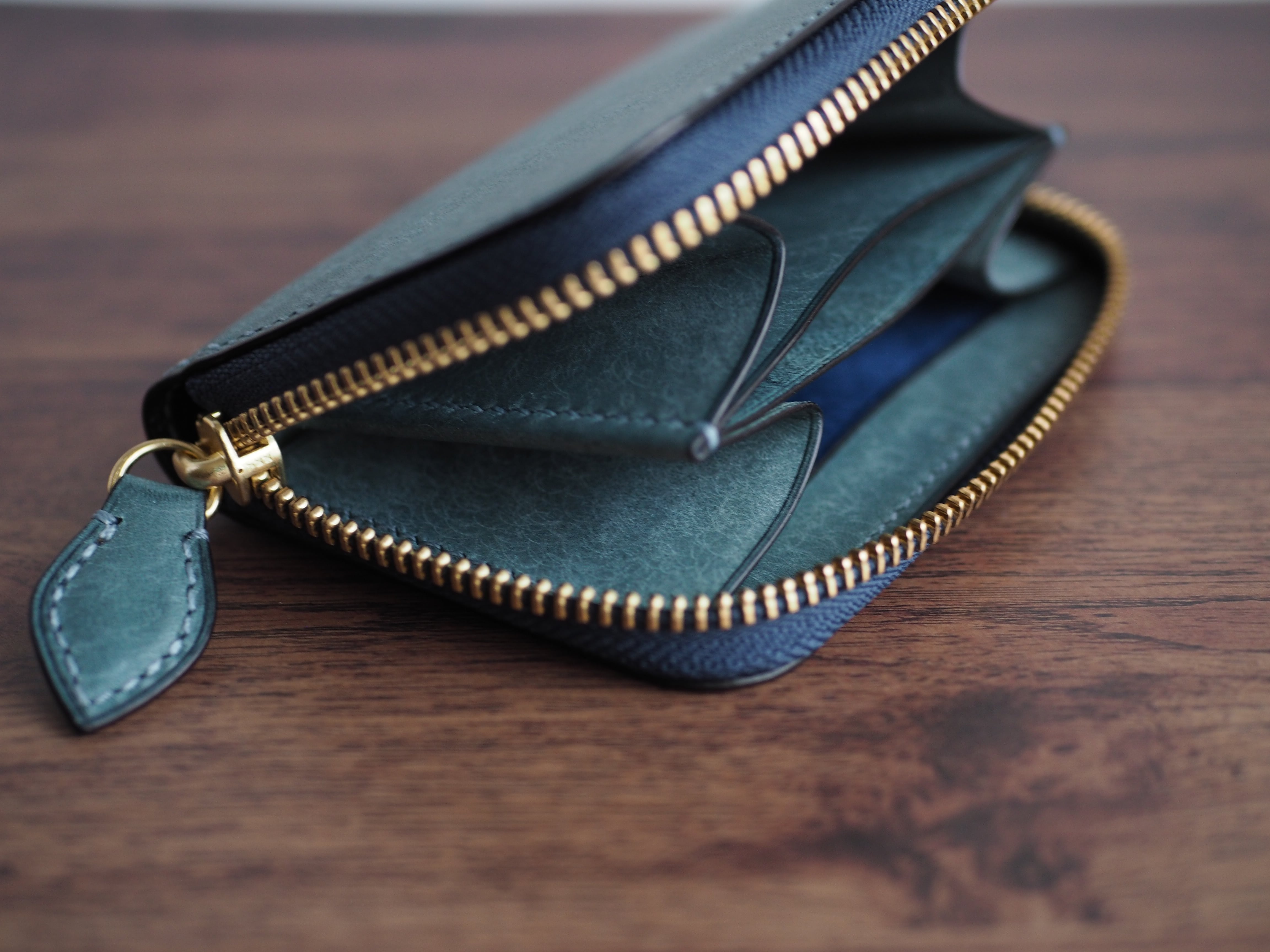 ご覧いただきありがとうございます。こちらは、イタリアンレザーマルゴーのアヴィオをメインに、カードポケットの一部にコバルトを使用(アヴィオは2025年10月に追加された新色になります)。全工程を手縫いで丁寧に製作したラウンドファスナーミニウォレットです。鮮やかなバイカラーの中に、本革ならではの劇的なエイジングと作り手のこだわりを凝縮しました。