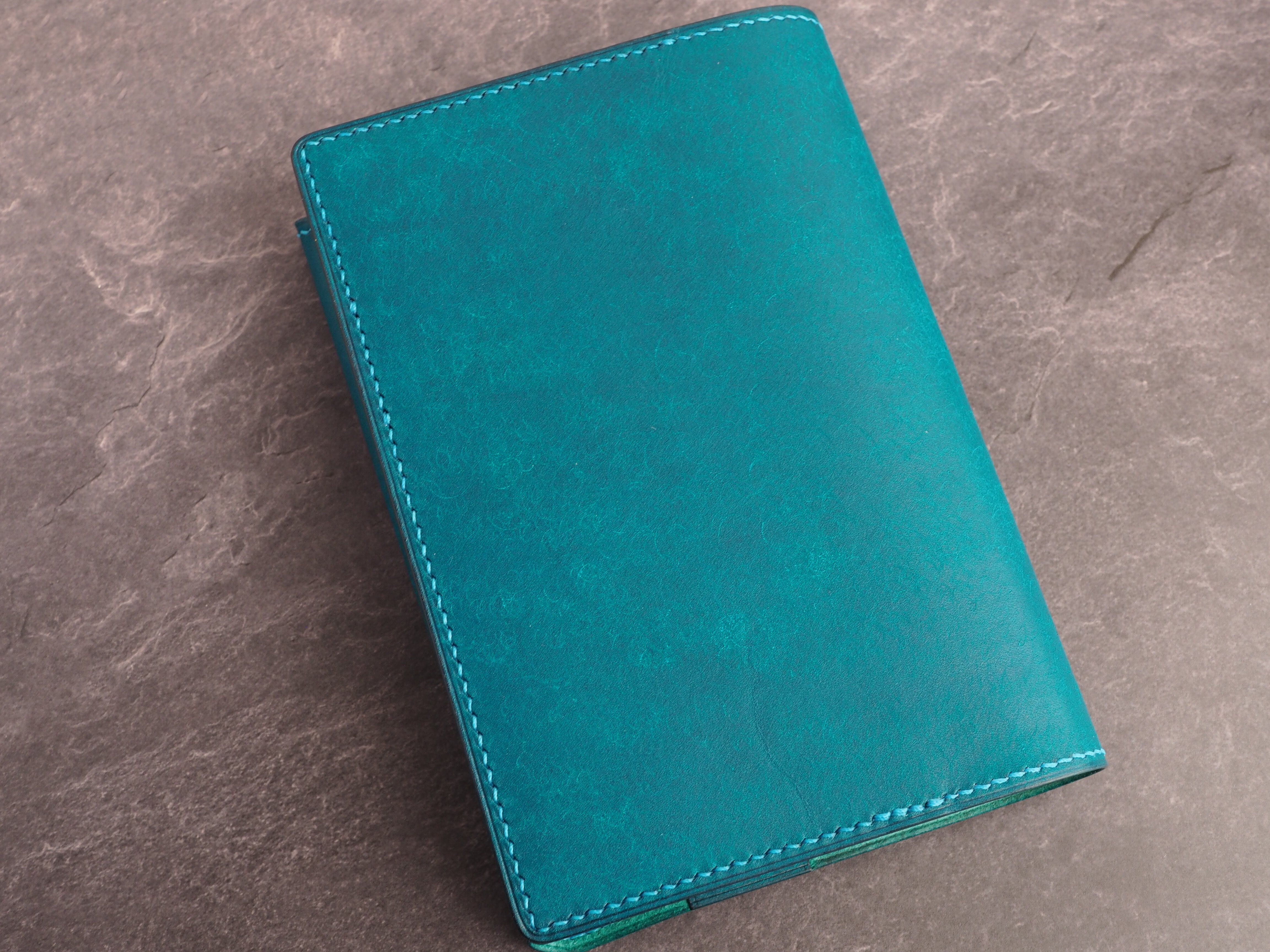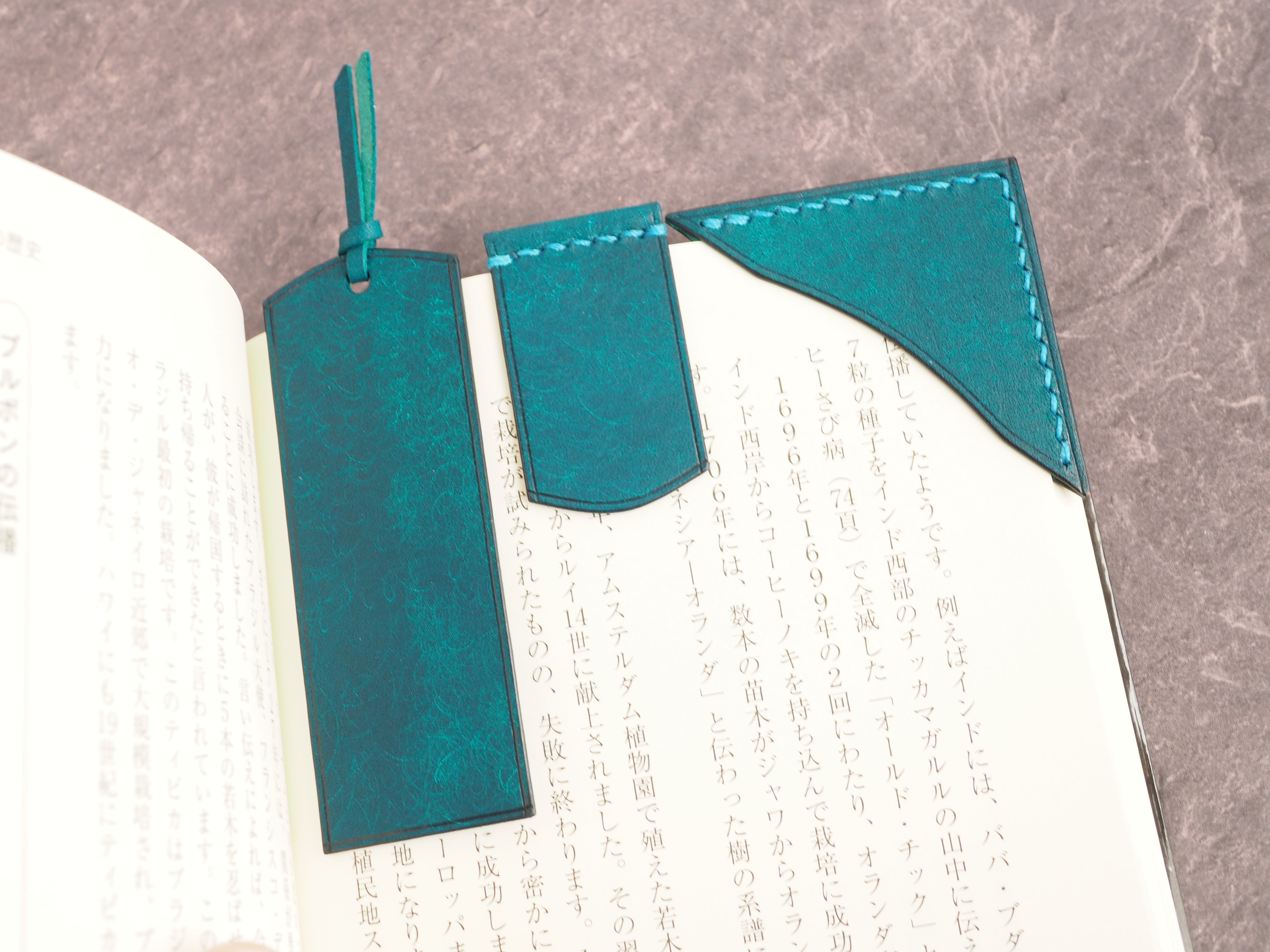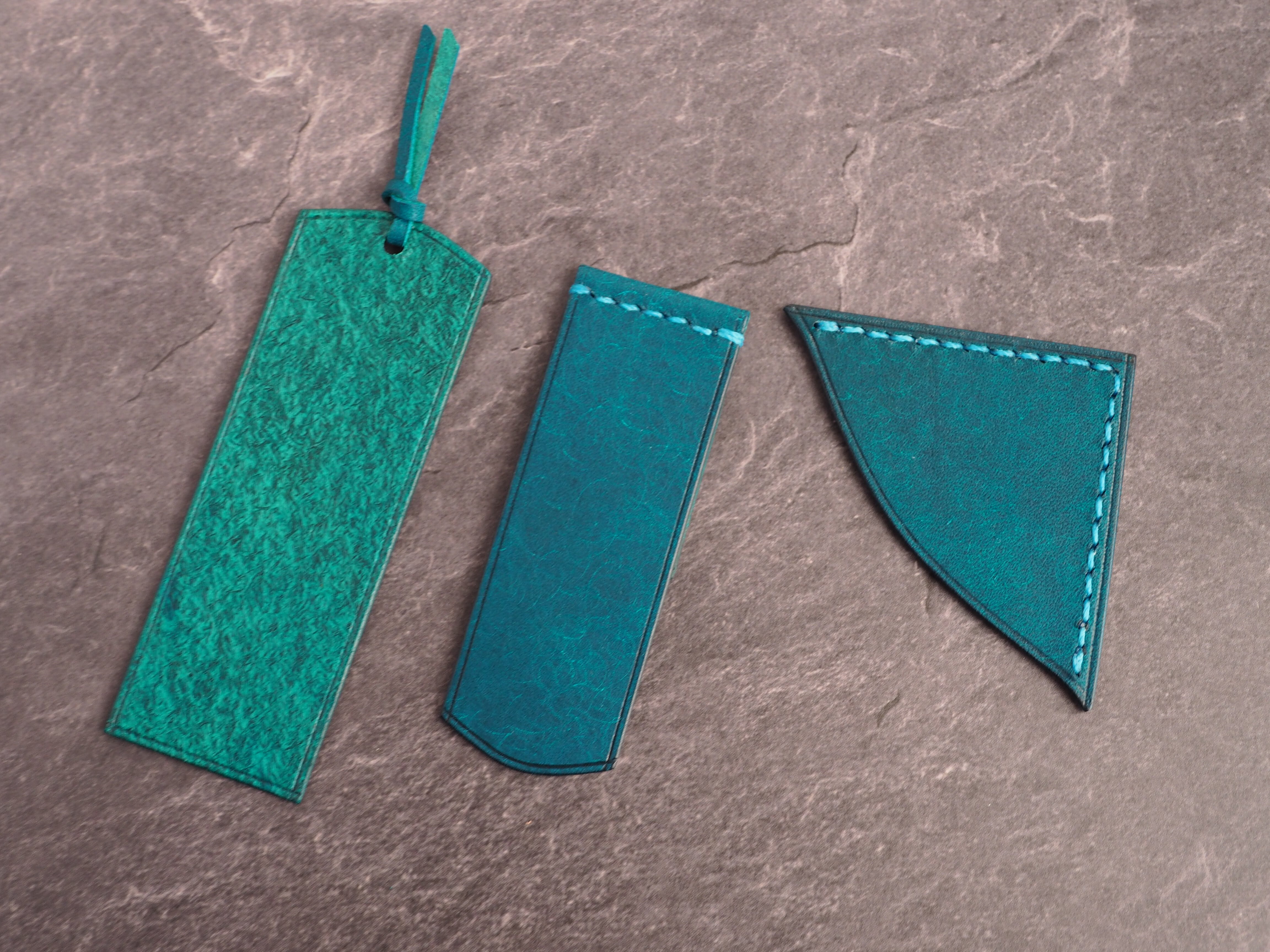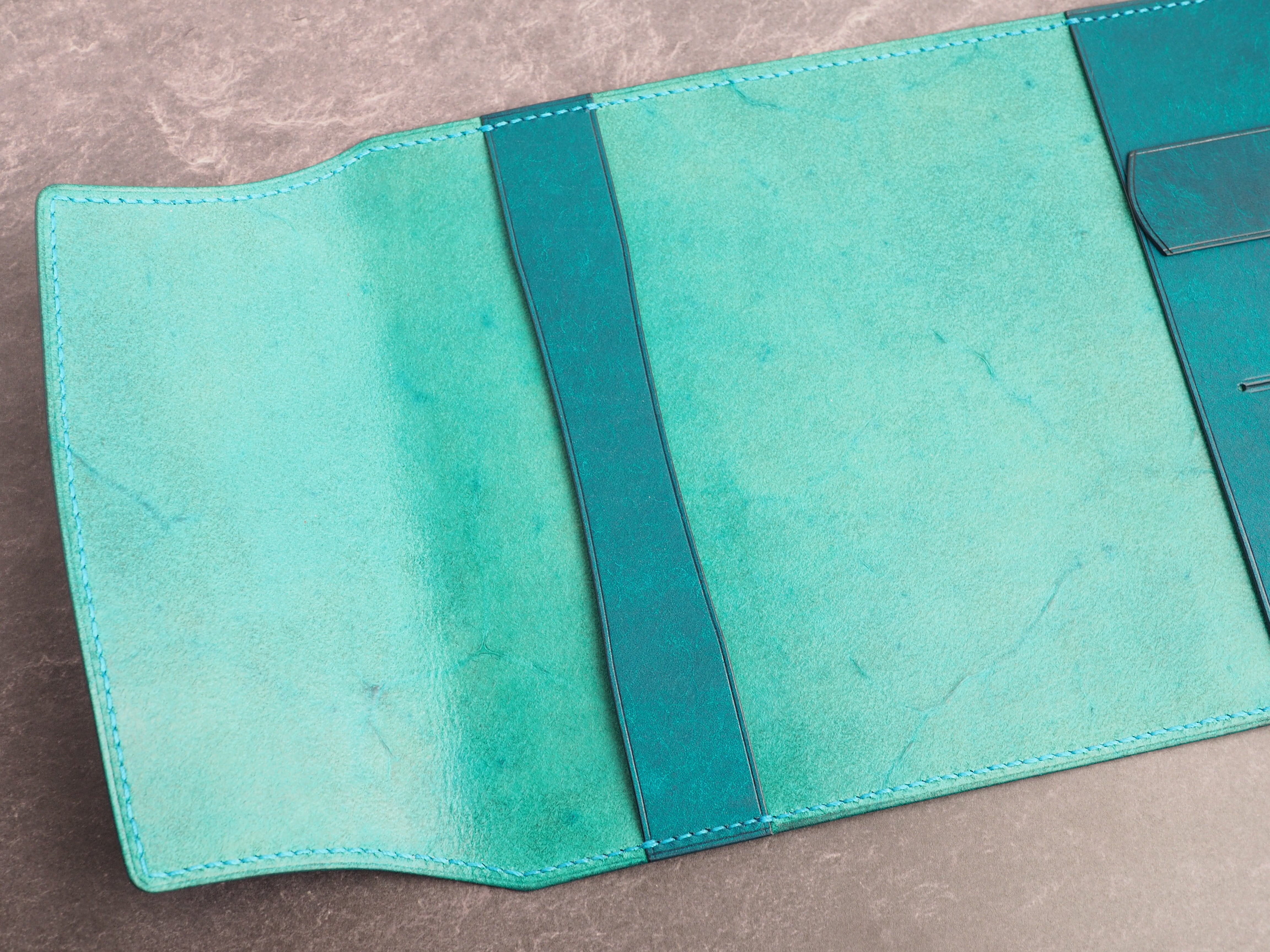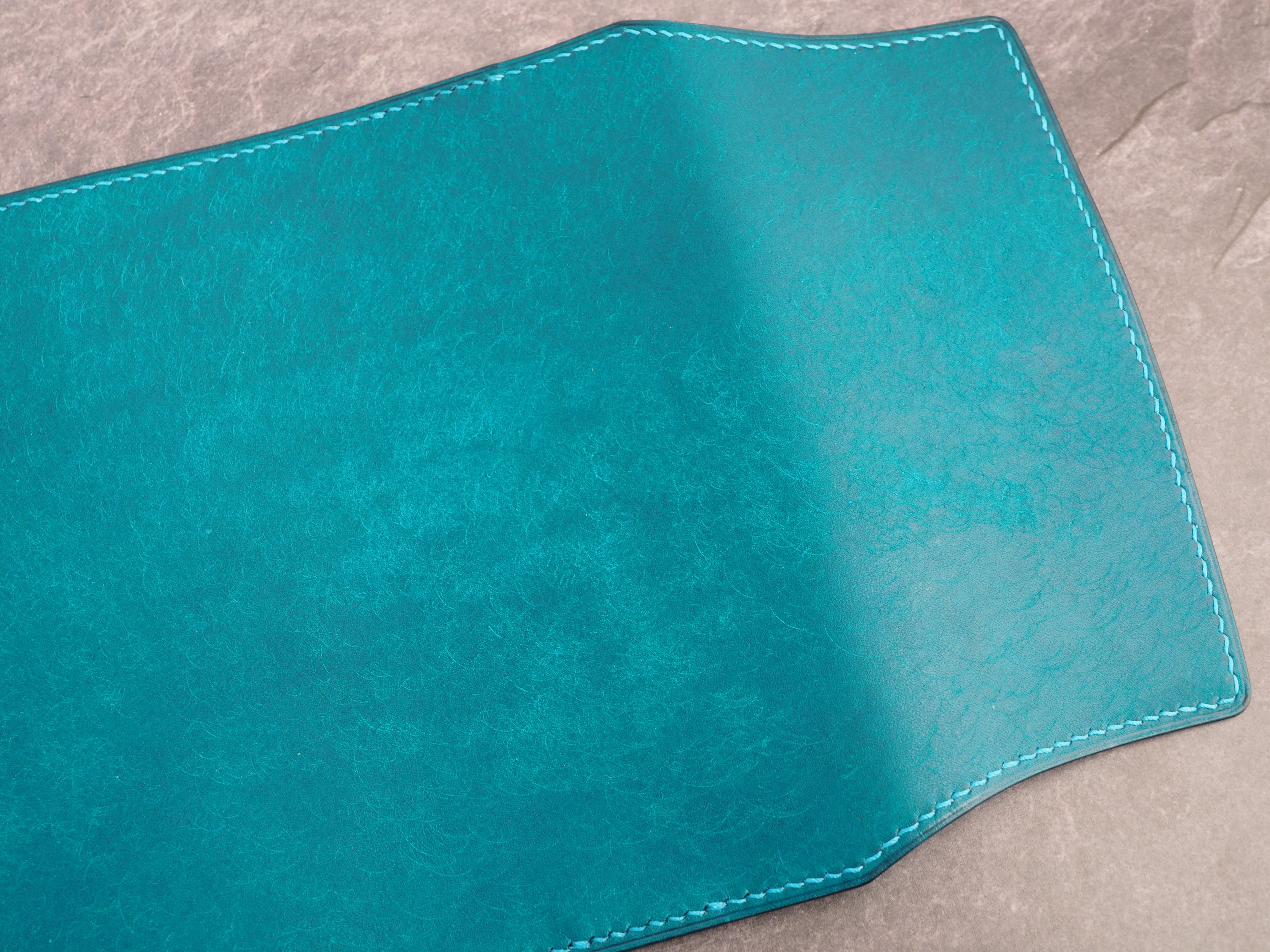イタリアンレザーマルゴー、トルケーゼ(トルコ石色、ターコイズ)を使用した文庫本用のブックカバーになります。糸は六花のアマルフィコースト使用。新型のハヤカワ文庫(15.6cm)は未対応です。本体備え付けの帯状のブックマークと今回は形、付ける場所の違う3種類のブックマークを付属しています。自分好みの読書スタイルを選んでいただけるようにです。初めての方にも革に触れる機会を増やそうと思い扱いやすいように設計しました。革は1ミリ前後の厚さのものを使用おり、首や肩周り、背中から切り出しています。よく動かす部位であるため革の表面にトラ(皺が虎の模様に見えるため)が入りやすい部分です。しなやかで丈夫なためお腹側に比べて強度があります。今回は革の素材感を生かすためにあえてシワ等を避けずに使用しています。こういったトラや血筋は革の魅力の一つであり、一部の方々に大変人気があります。自分好みのトラ模様を探す人、血筋の個体差を楽しむ革好きの方が増えているようです。