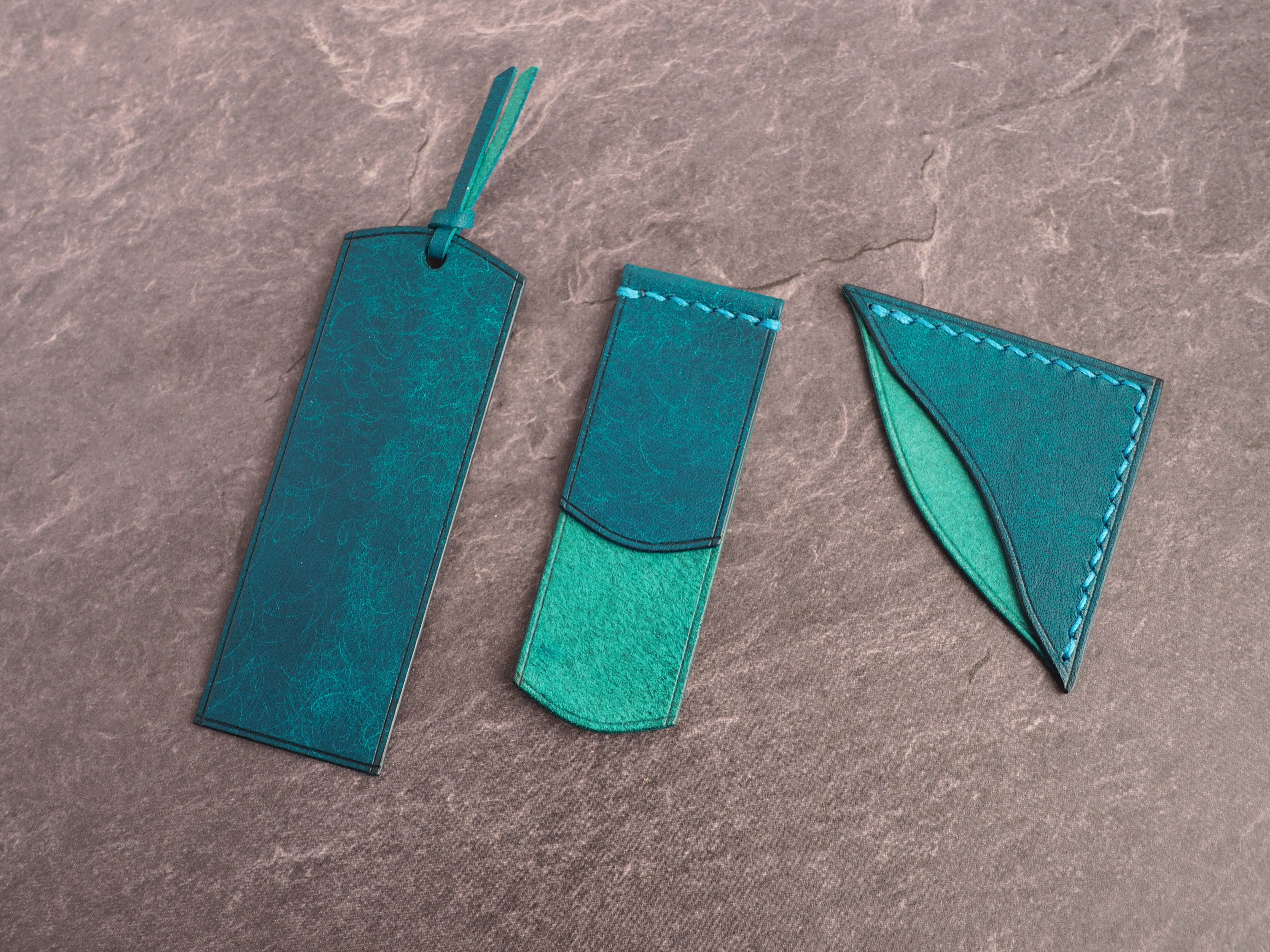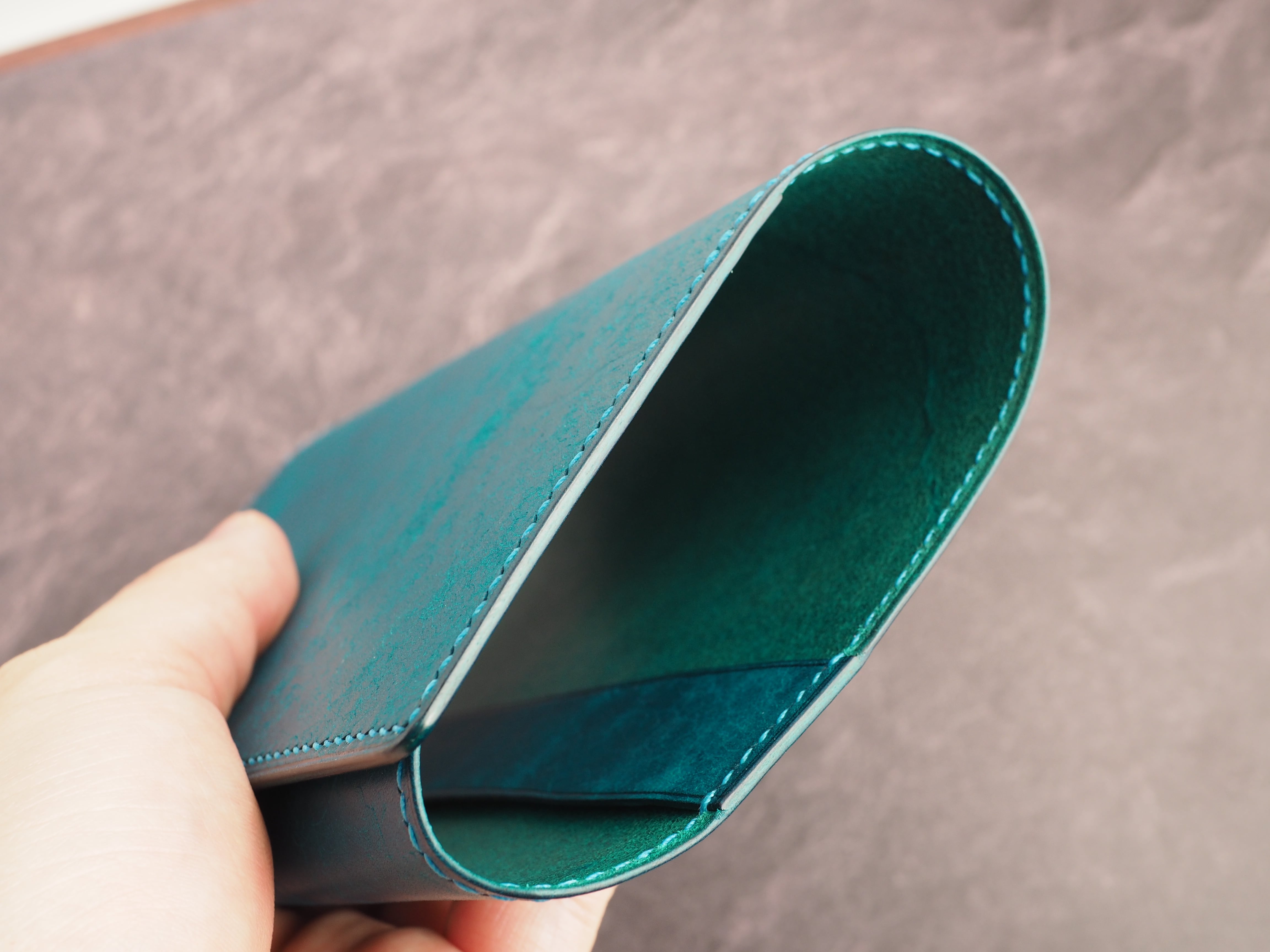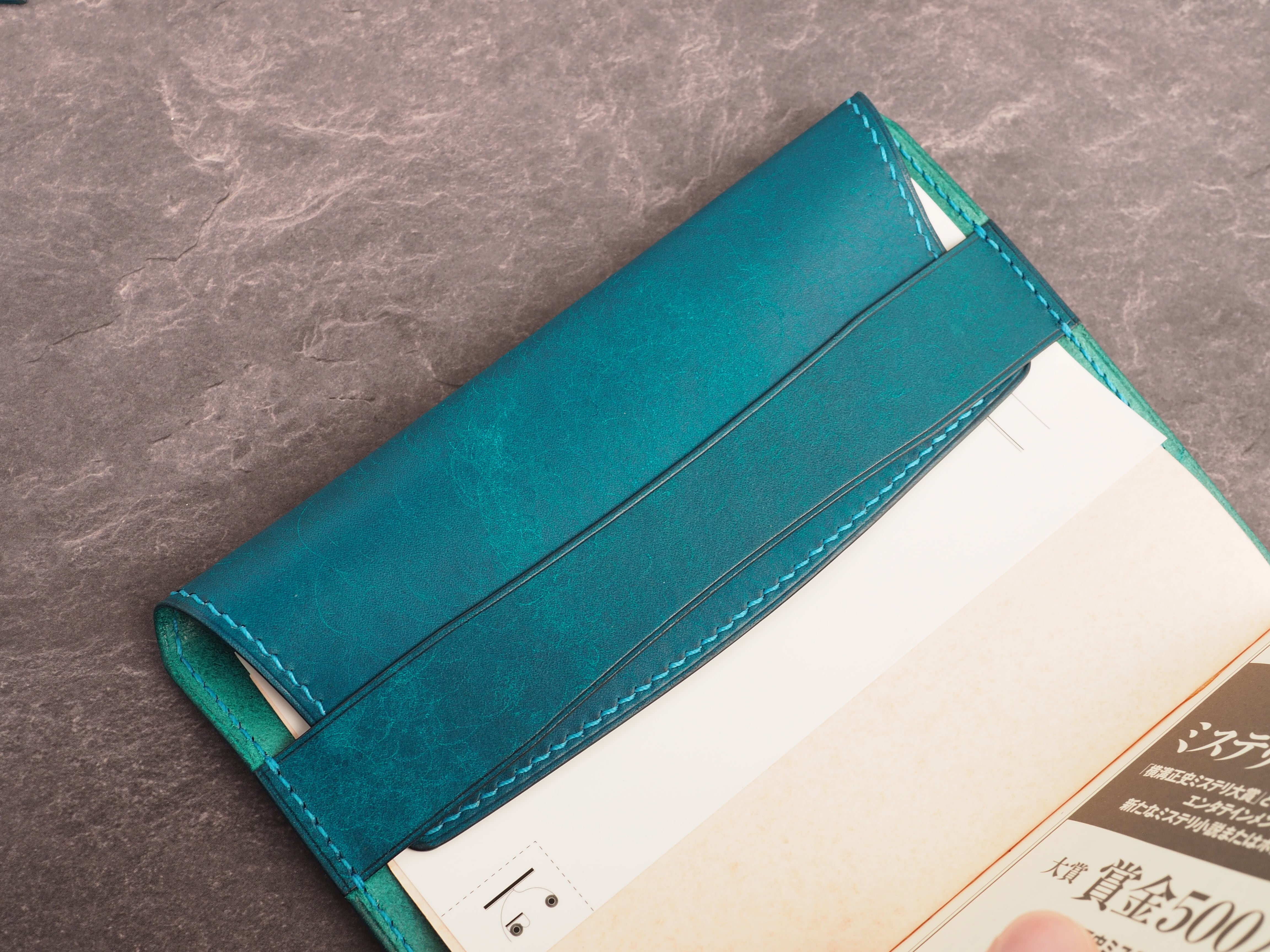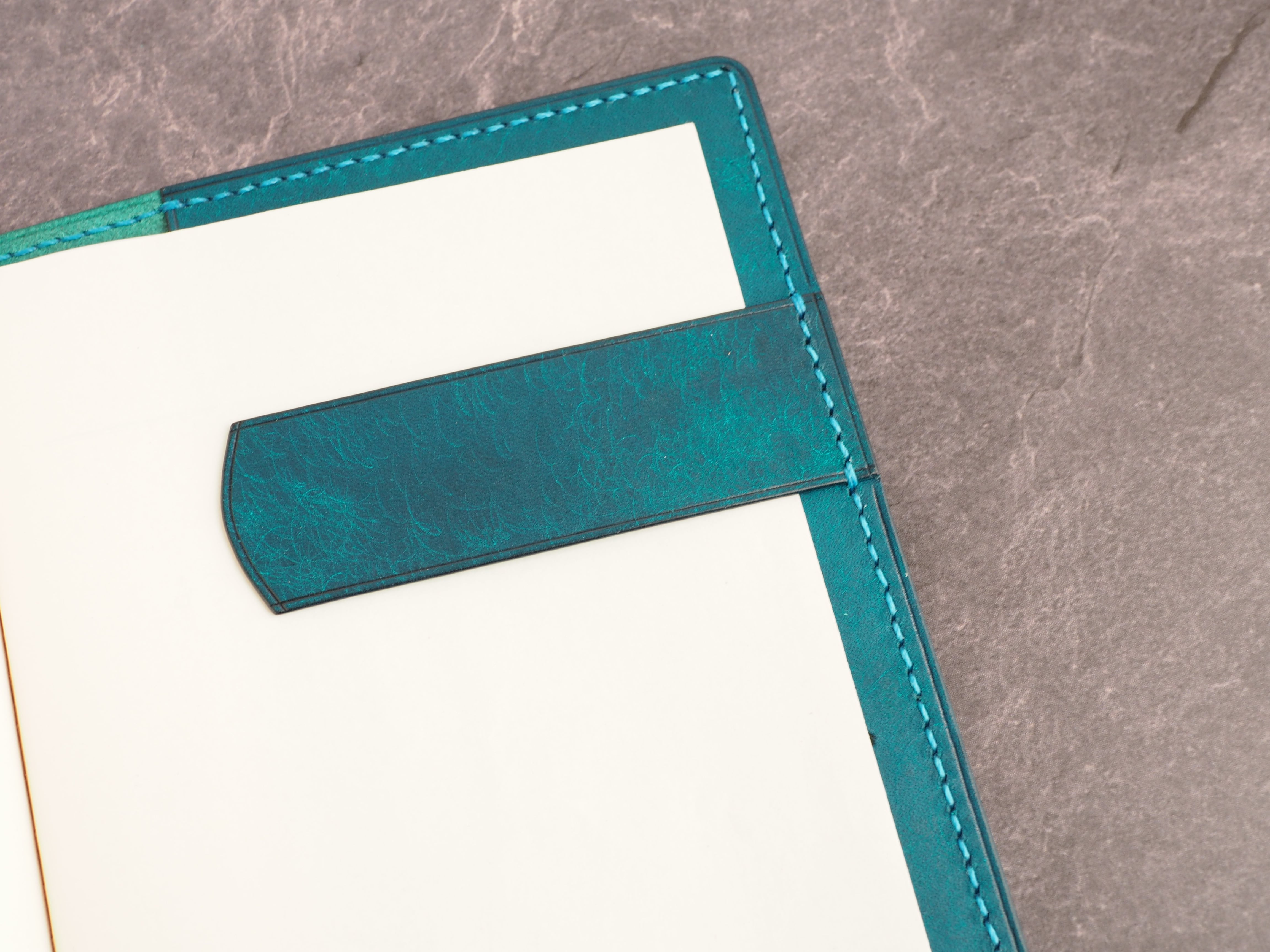 イタリアンレザーマルゴー、トルケーゼ(トルコ石色、ターコイズ)を使用した文庫本用のブックカバーになります。糸は六花のアマルフィコースト使用。新型のハヤカワ文庫(15.6cm)は未対応です。本体備え付けの帯状のブックマークと今回は形、付ける場所の違う3種類のブックマークを付属しています。自分好みの読書スタイルを選んでいただけるようにです。初めての方にも革に触れる機会を増やそうと思い扱いやすいように設計しました。革は1ミリ前後の厚さのものを使用おり、首や肩周り、背中から切り出しています。よく動かす部位であるため革の表面にトラ(皺が虎の模様に見えるため)が入りやすい部分です。しなやかで丈夫なためお腹側に比べて強度があります。今回は革の素材感を生かすためにあえてシワ等を避けずに使用しています。こういったトラや血筋は革の魅力の一つであり、一部の方々に大変人気があります。自分好みのトラ模様を探す人、血筋の個体差を楽しむ革好きの方が増えているようです。