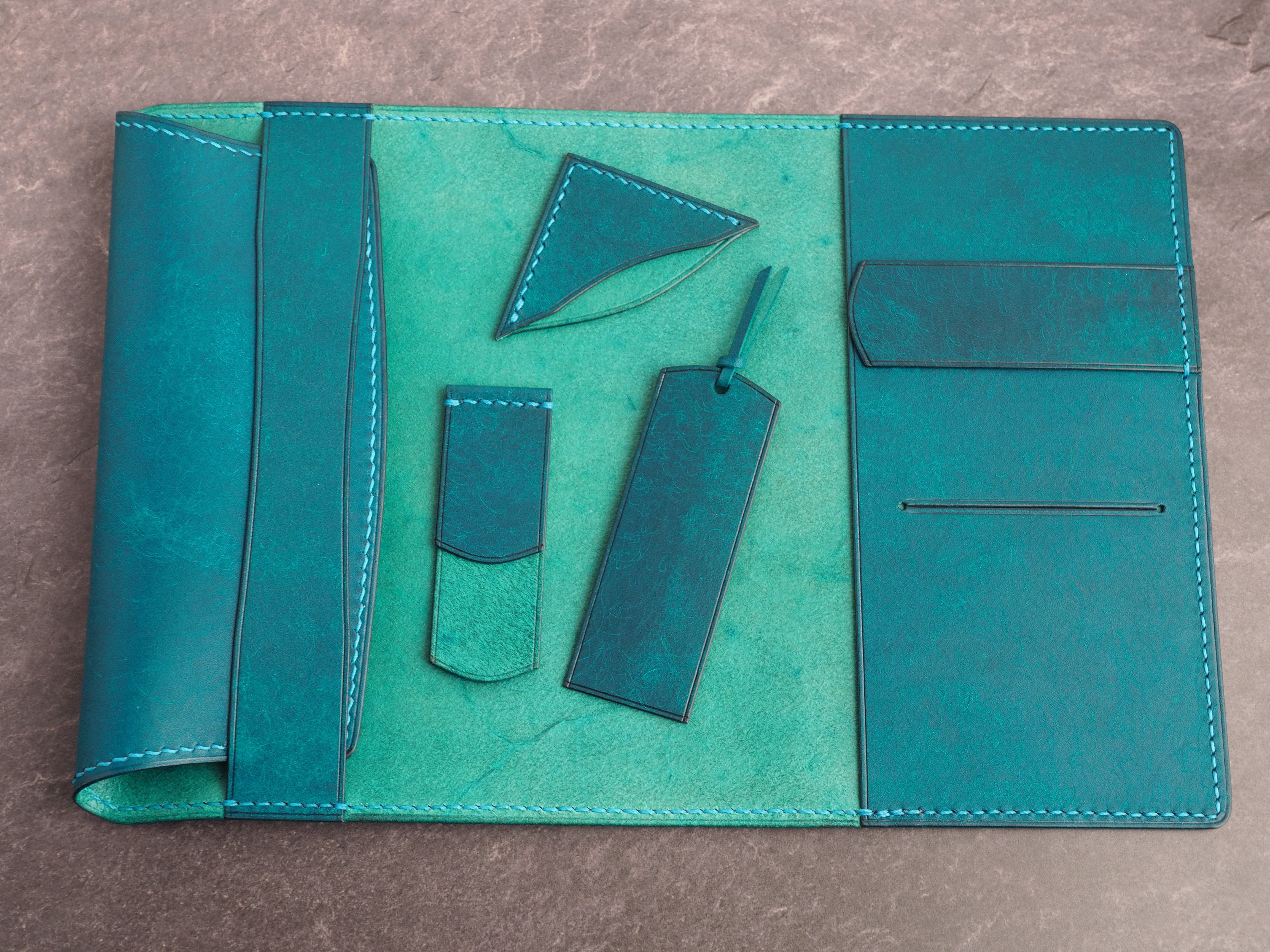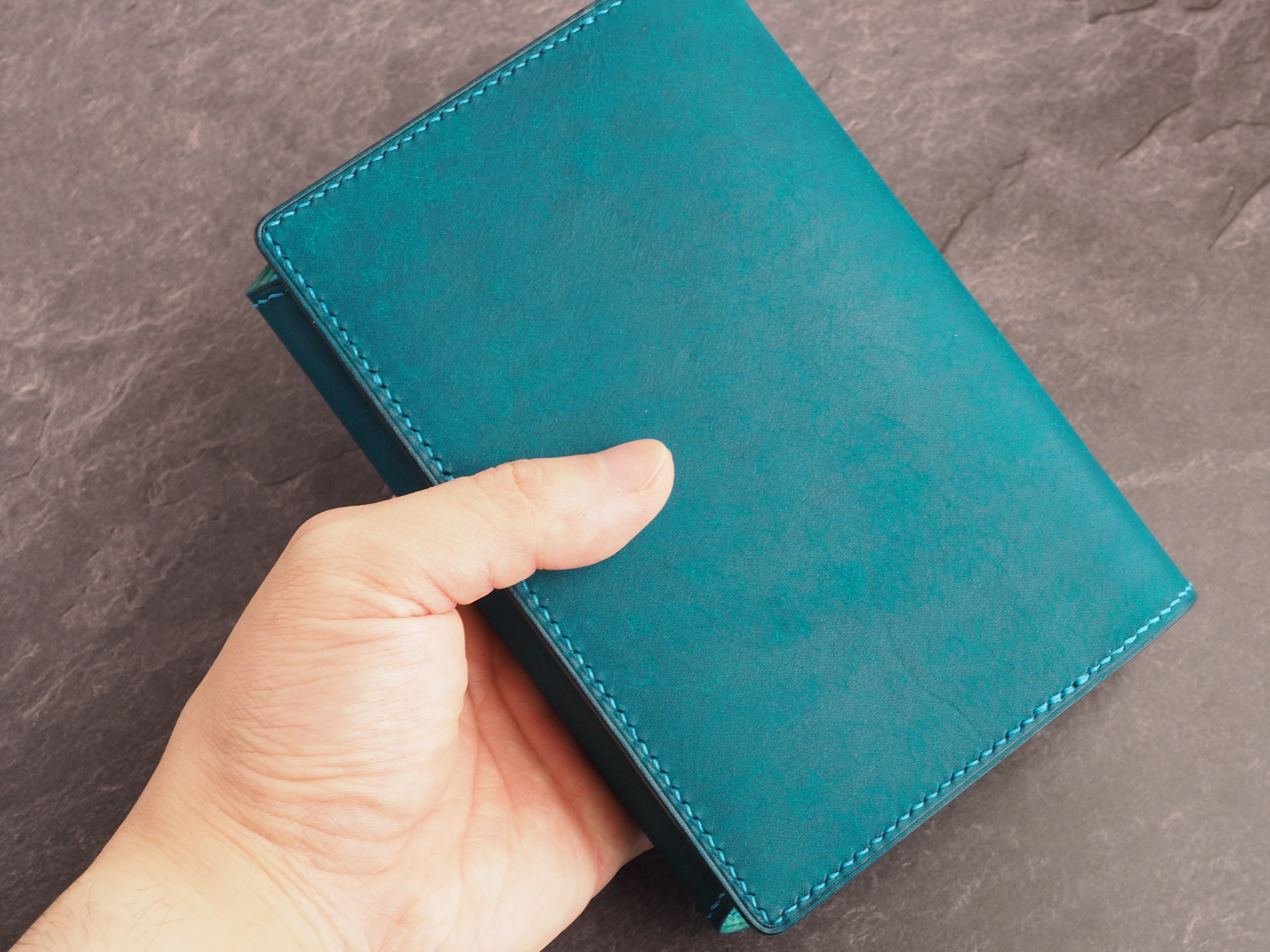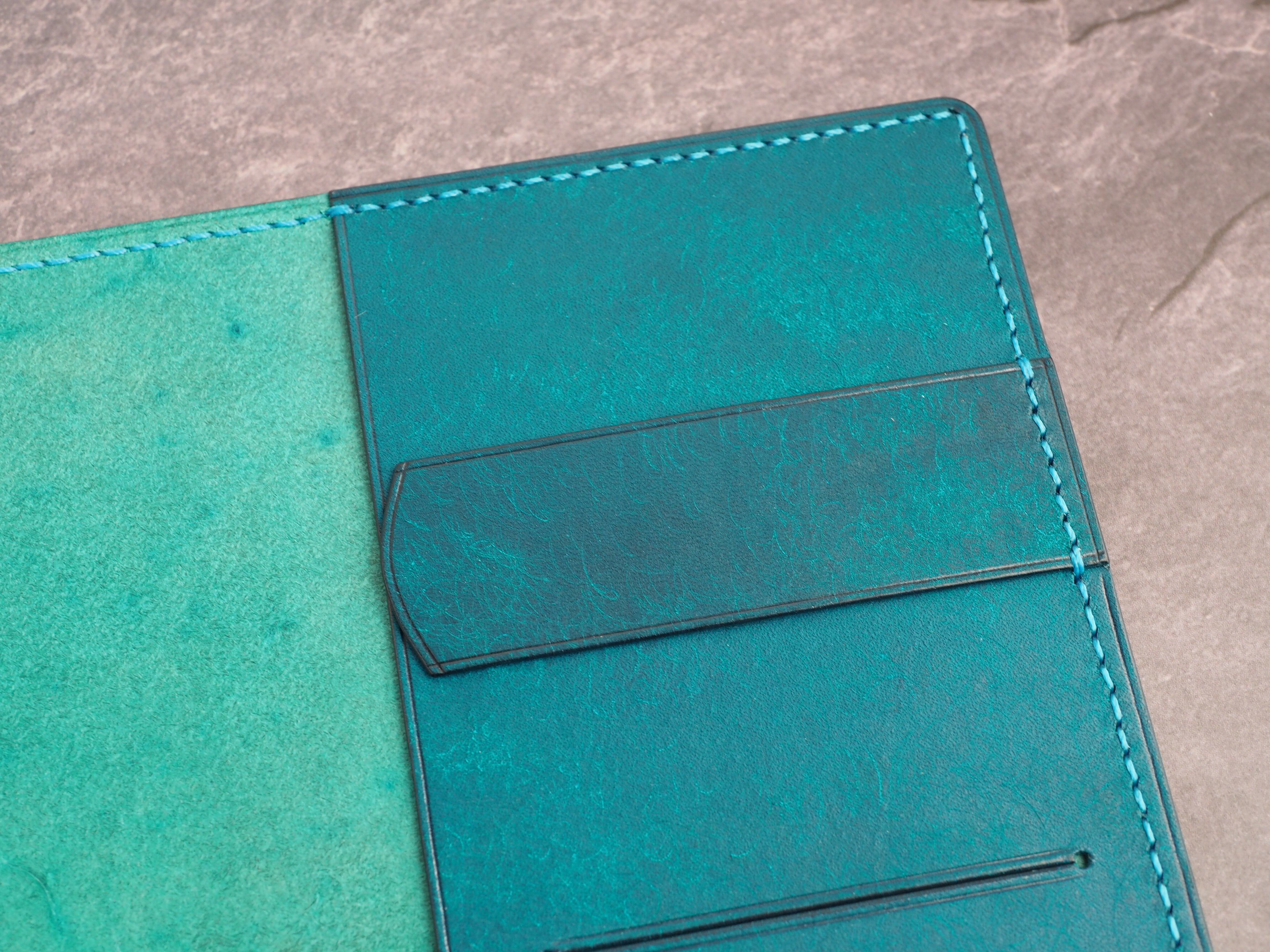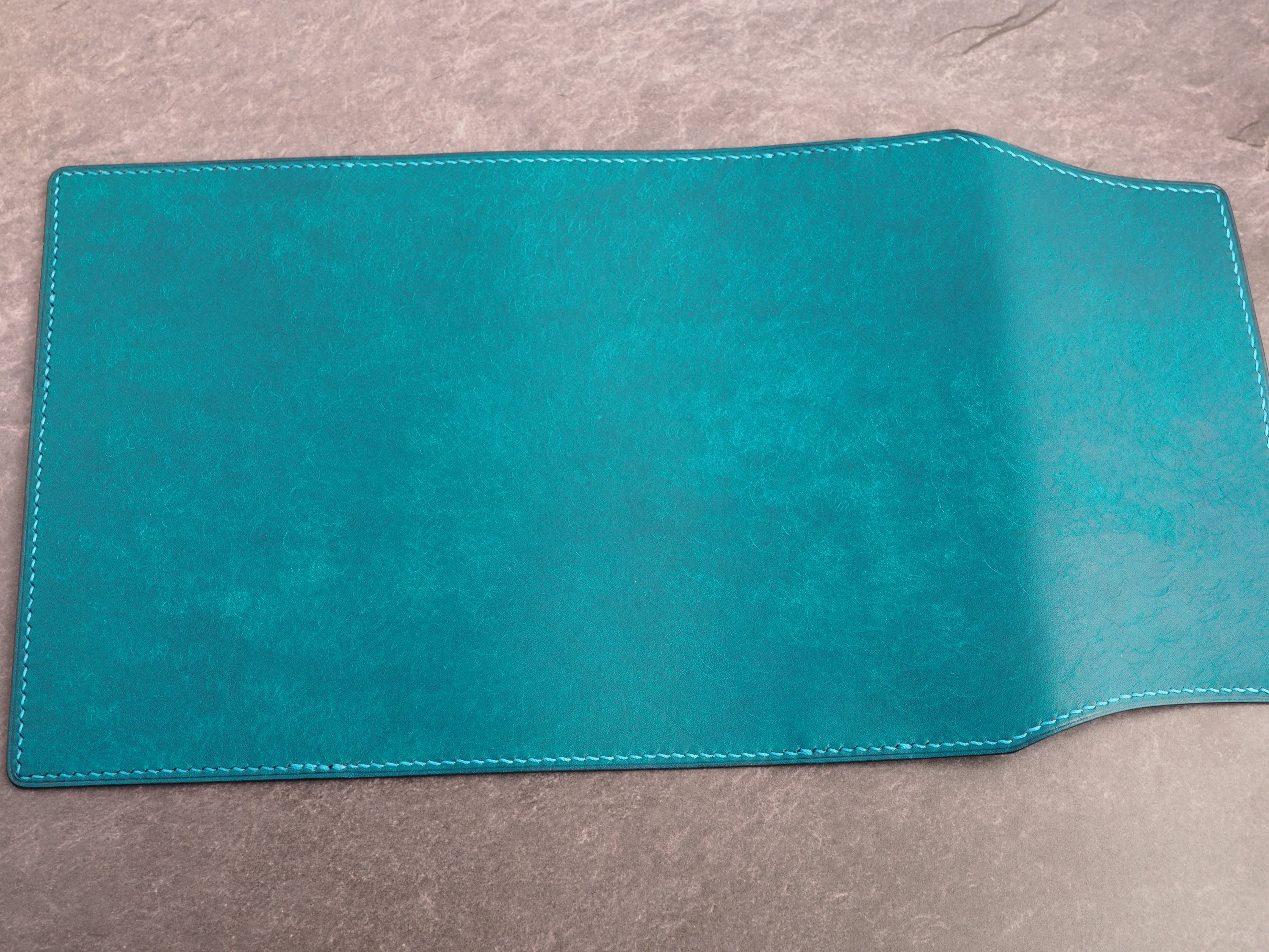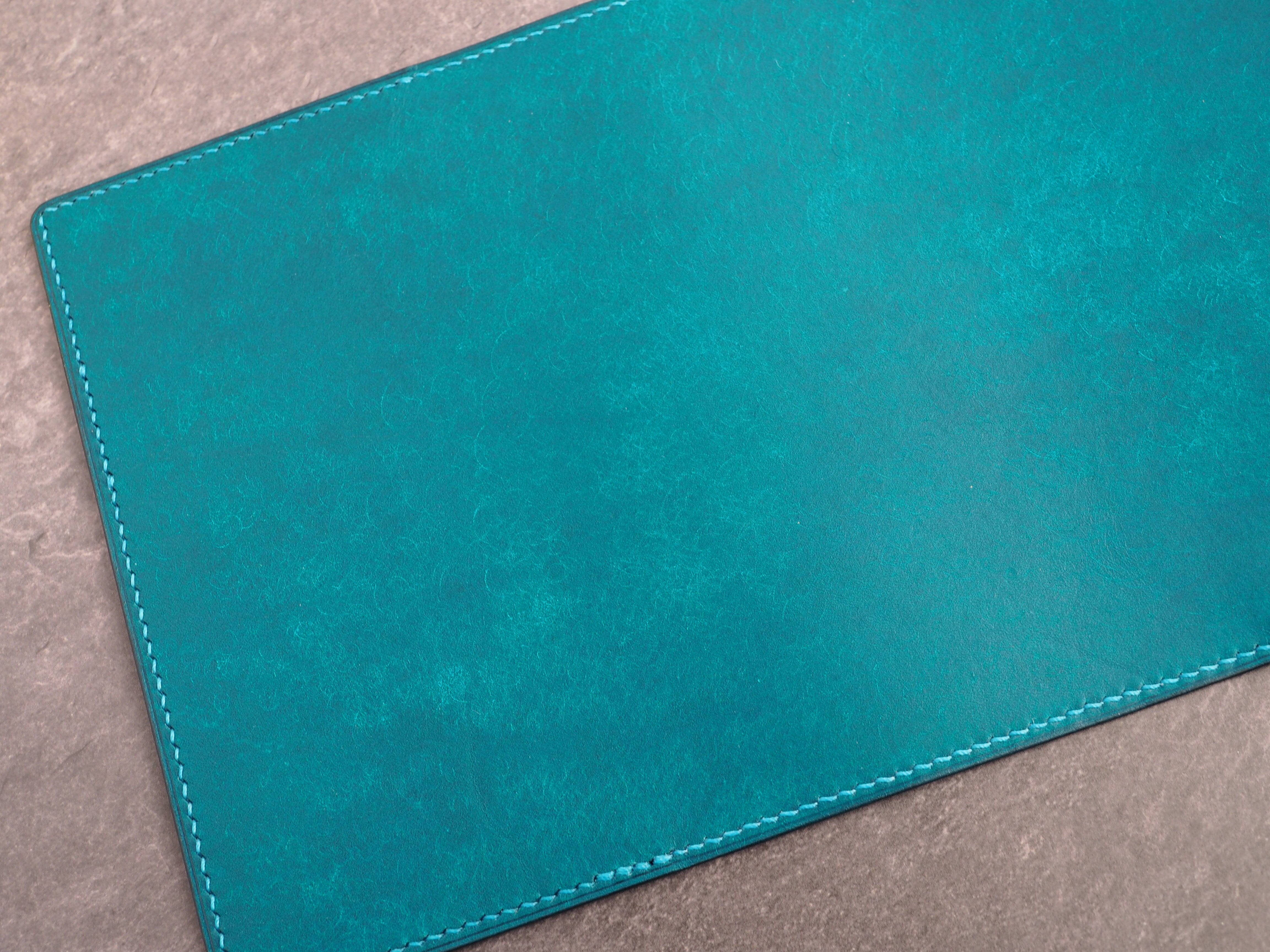 イタリアンレザーマルゴー、トルケーゼ(トルコ石色、ターコイズ)を使用した文庫本用のブックカバーになります。糸は六花のアマルフィコースト使用。新型のハヤカワ文庫(15.6cm)は未対応です。本体備え付けの帯状のブックマークと今回は形、付ける場所の違う3種類のブックマークを付属しています。自分好みの読書スタイルを選んでいただけるようにです。初めての方にも革に触れる機会を増やそうと思い扱いやすいように設計しました。革は1ミリ前後の厚さのものを使用おり、首や肩周り、背中から切り出しています。よく動かす部位であるため革の表面にトラ(皺が虎の模様に見えるため)が入りやすい部分です。しなやかで丈夫なためお腹側に比べて強度があります。今回は革の素材感を生かすためにあえてシワ等を避けずに使用しています。こういったトラや血筋は革の魅力の一つであり、一部の方々に大変人気があります。自分好みのトラ模様を探す人、血筋の個体差を楽しむ革好きの方が増えているようです。