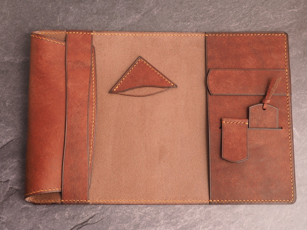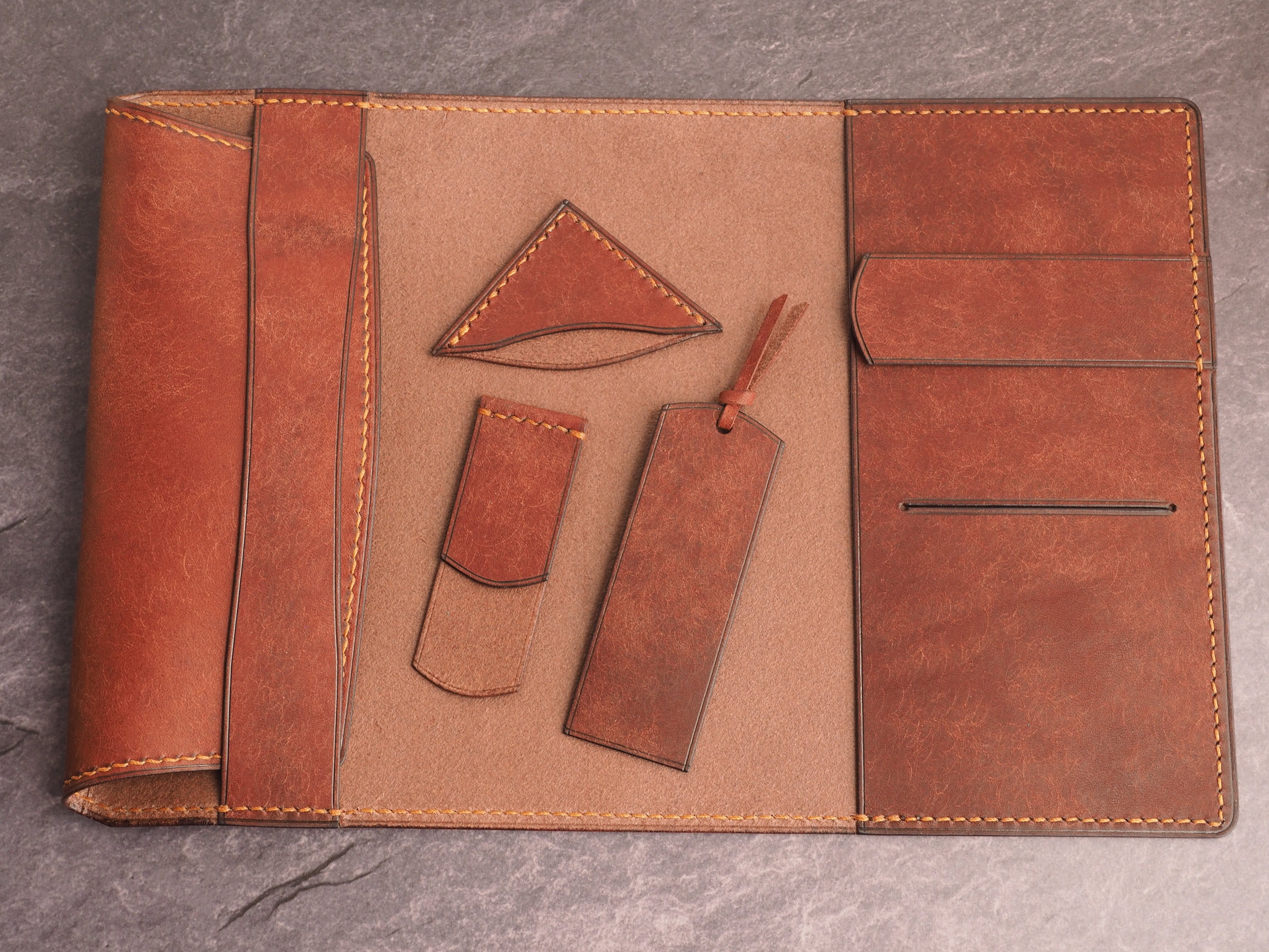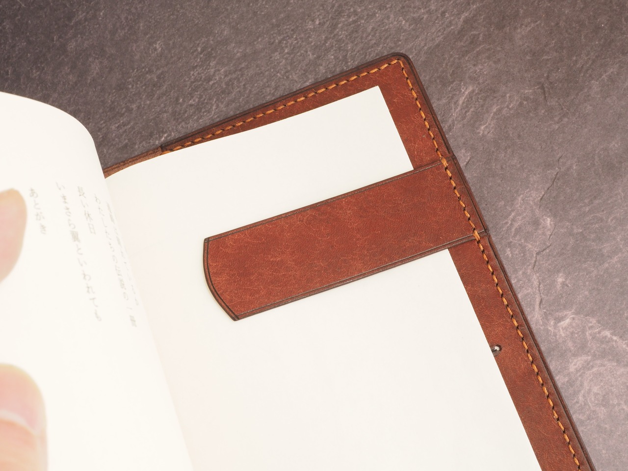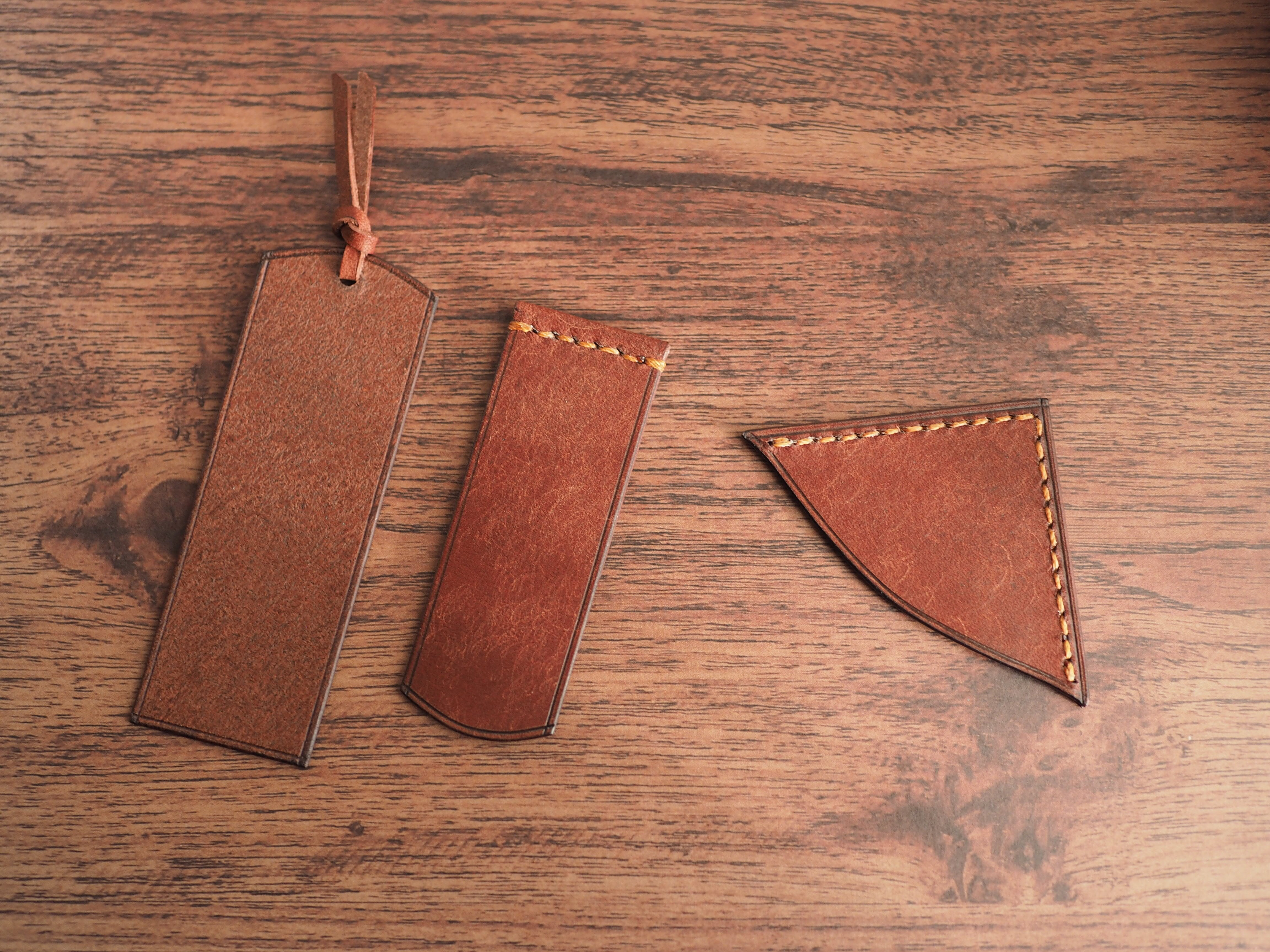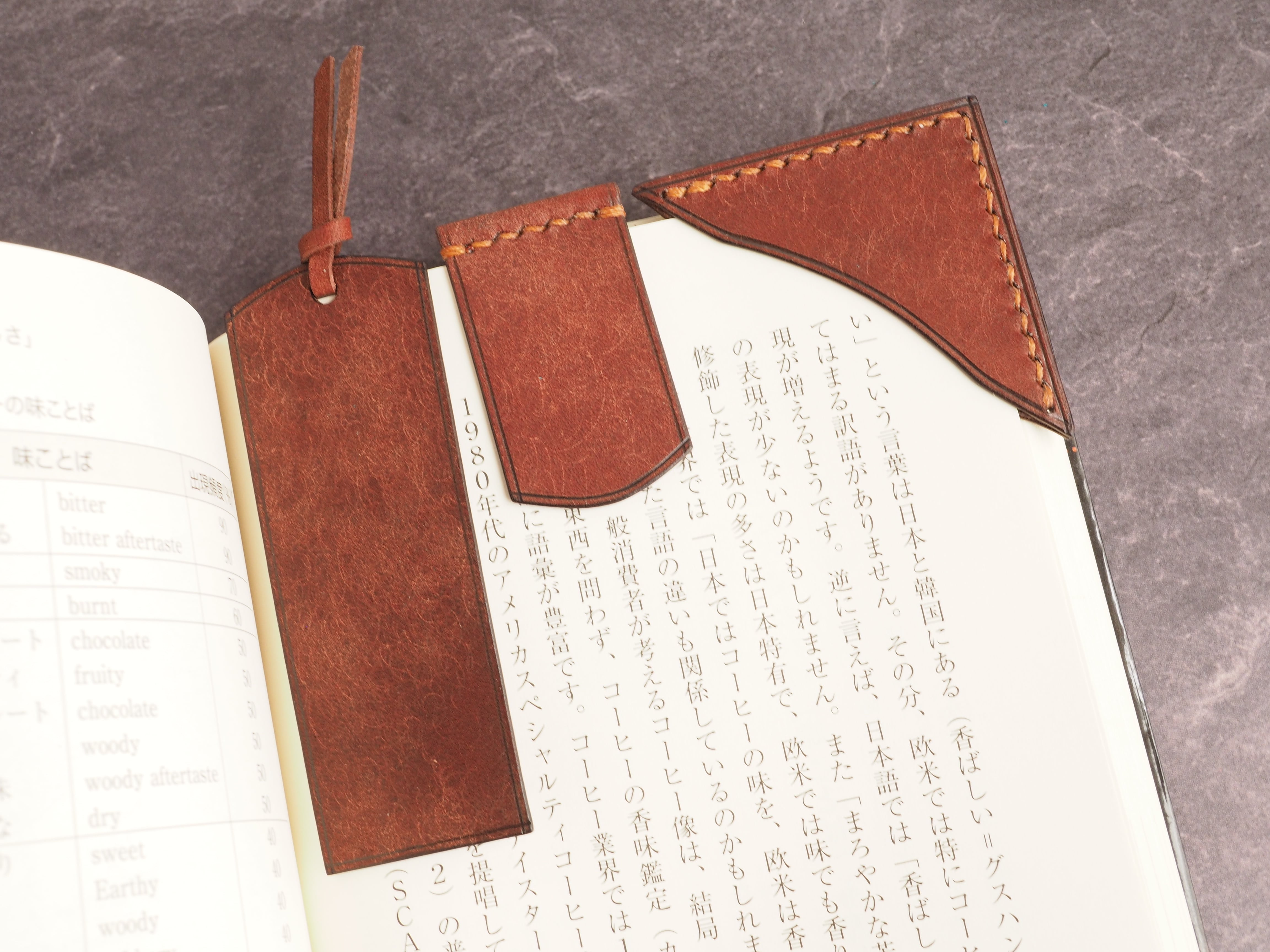 イタリアンレザーマルゴー、ダークブラウンを使用した文庫本用のブックカバーになります。新型のハヤカワ文庫(15.6cm)は未対応です。本体備え付けの帯状のブックマークと今回は形、つける場所の違う3種類のブックマークを付属しています。自分好みの読書スタイルを選んでいただけるようにです。初めての方にも革に触れる機会を増やそうと思い扱いやすいように設計しました。革は1ミリ前後の厚さのものを使用おり、首や肩周り、背中から切り出しています。よく動かす部位であるため革の表面にトラ(皺が虎の模様に見えるため)が入りやすい部分です。しなやかで丈夫なためお腹側に比べて強度があります。今回は革の素材感を生かすためにあえてシワ等を避けずに使用しています。こういったトラや血筋は革の魅力の一つであり、一部の方々に大変人気があります。自分好みのトラ模様を探す人、血筋の個体差を楽しむ革好きの方が増えているようです。