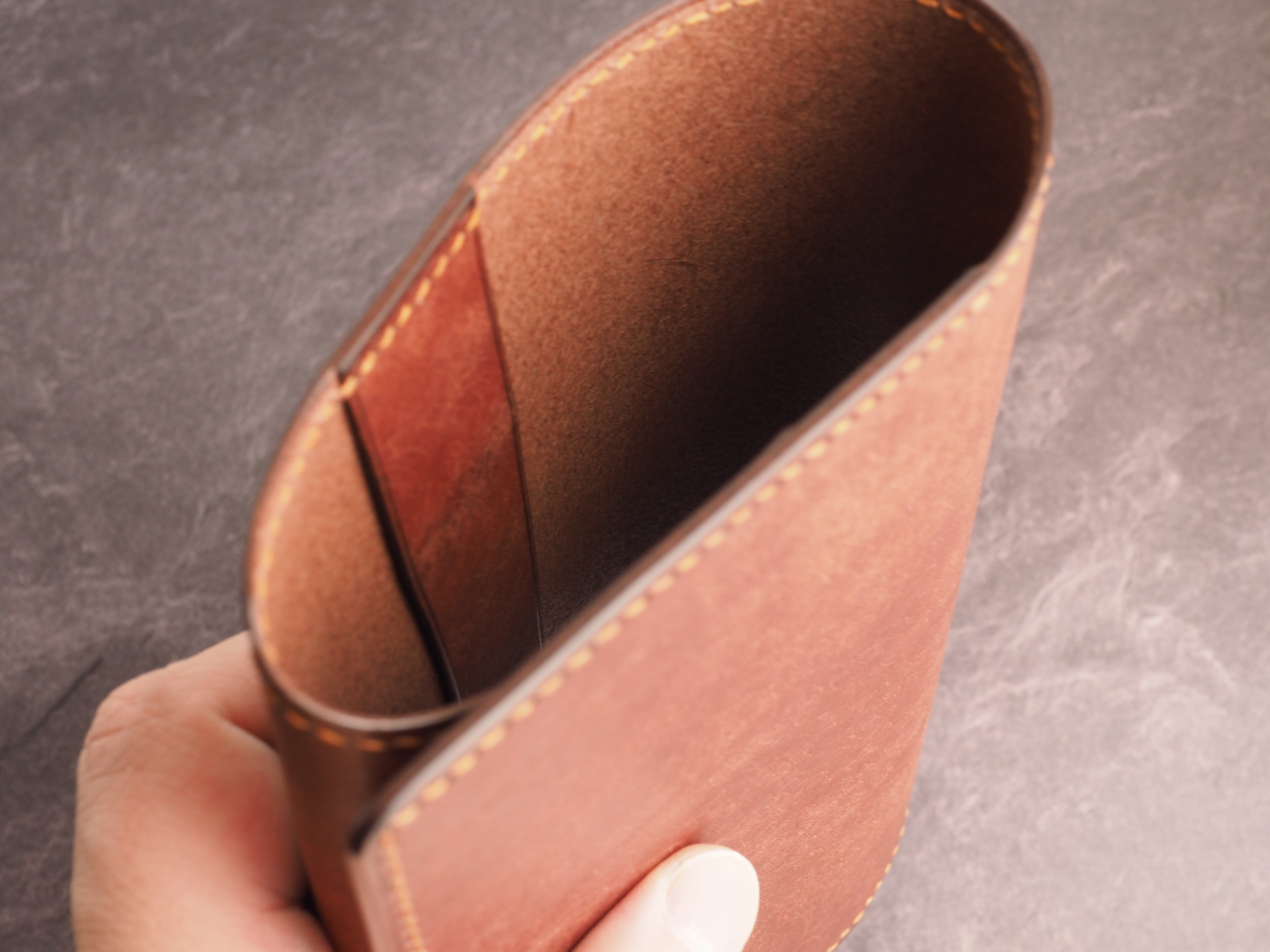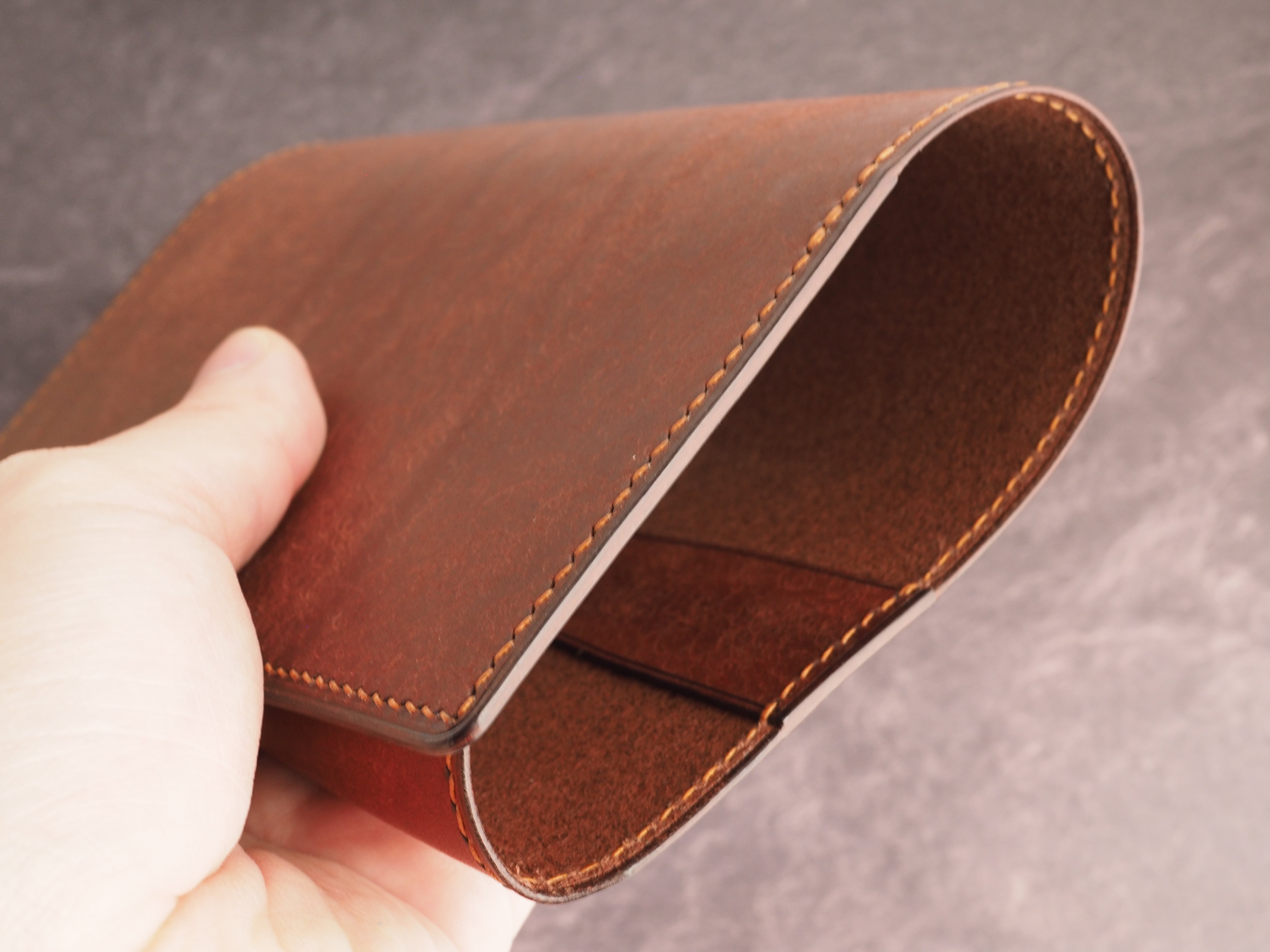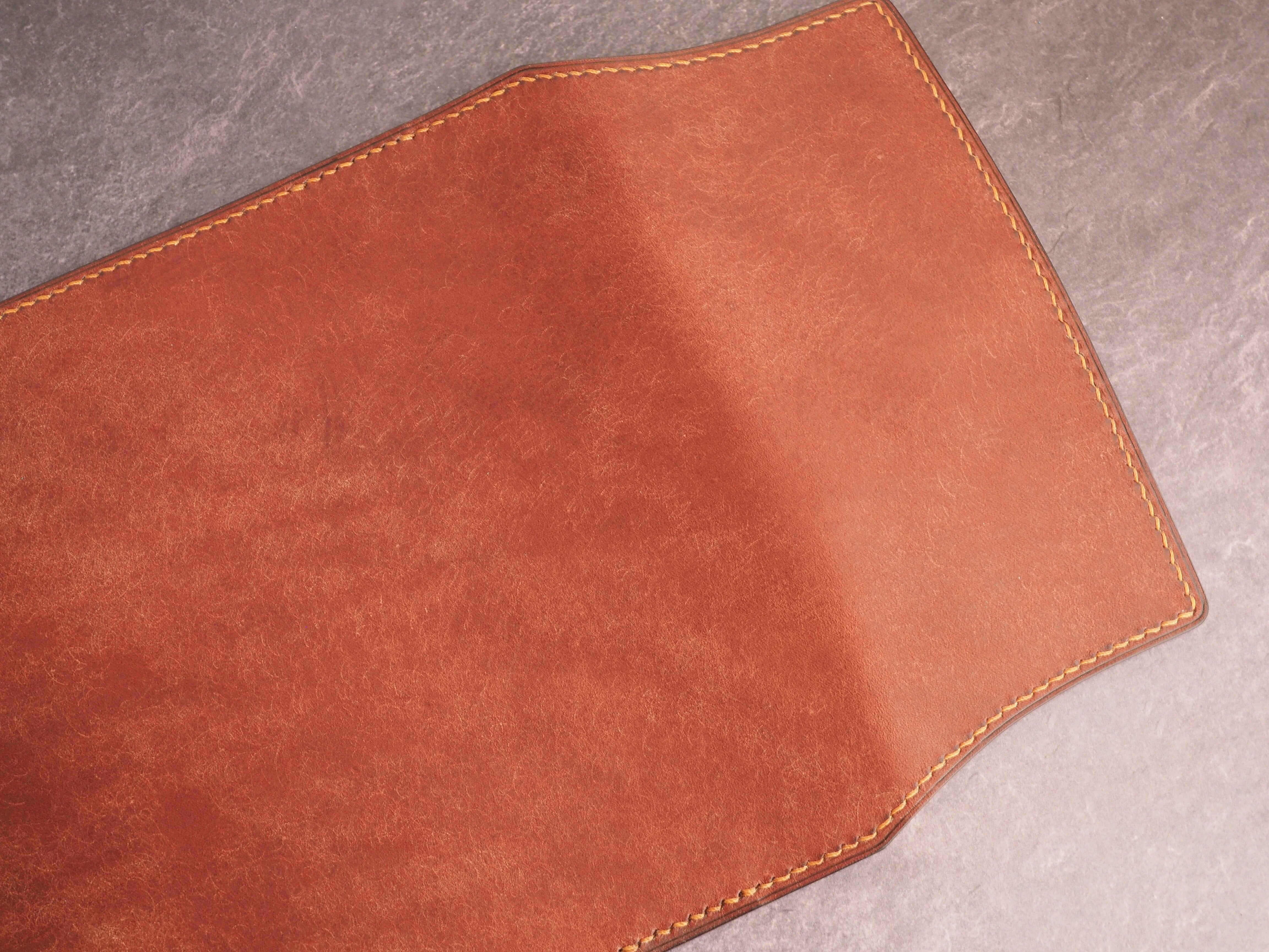 コバは植物性のロウを含む磨き剤を使い、磨いた後に周囲に飾り稔を施し手縫いで縫ってます。一手一手糸を引き締めることにより補強、伸び防止、装飾の効果があります。