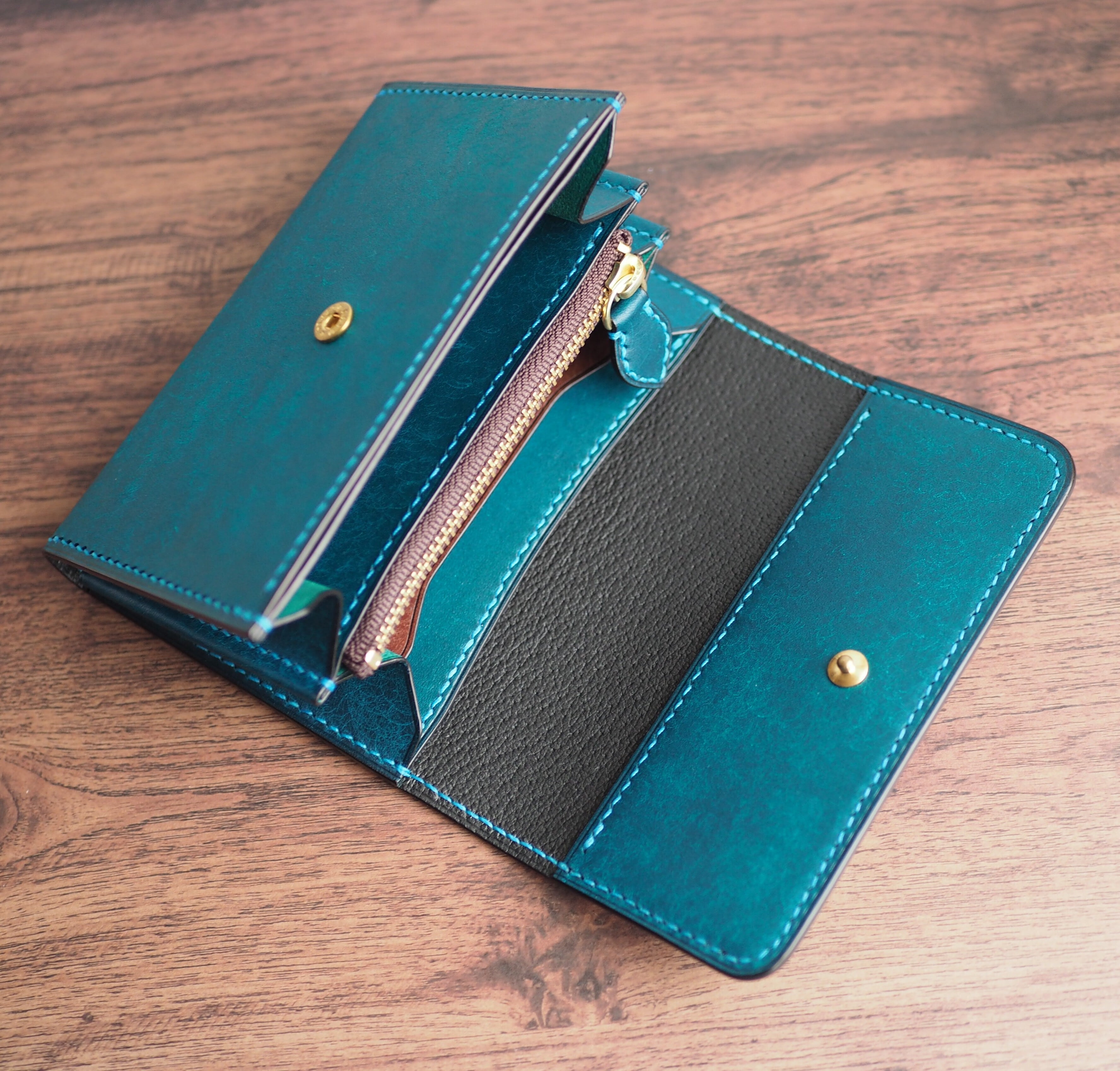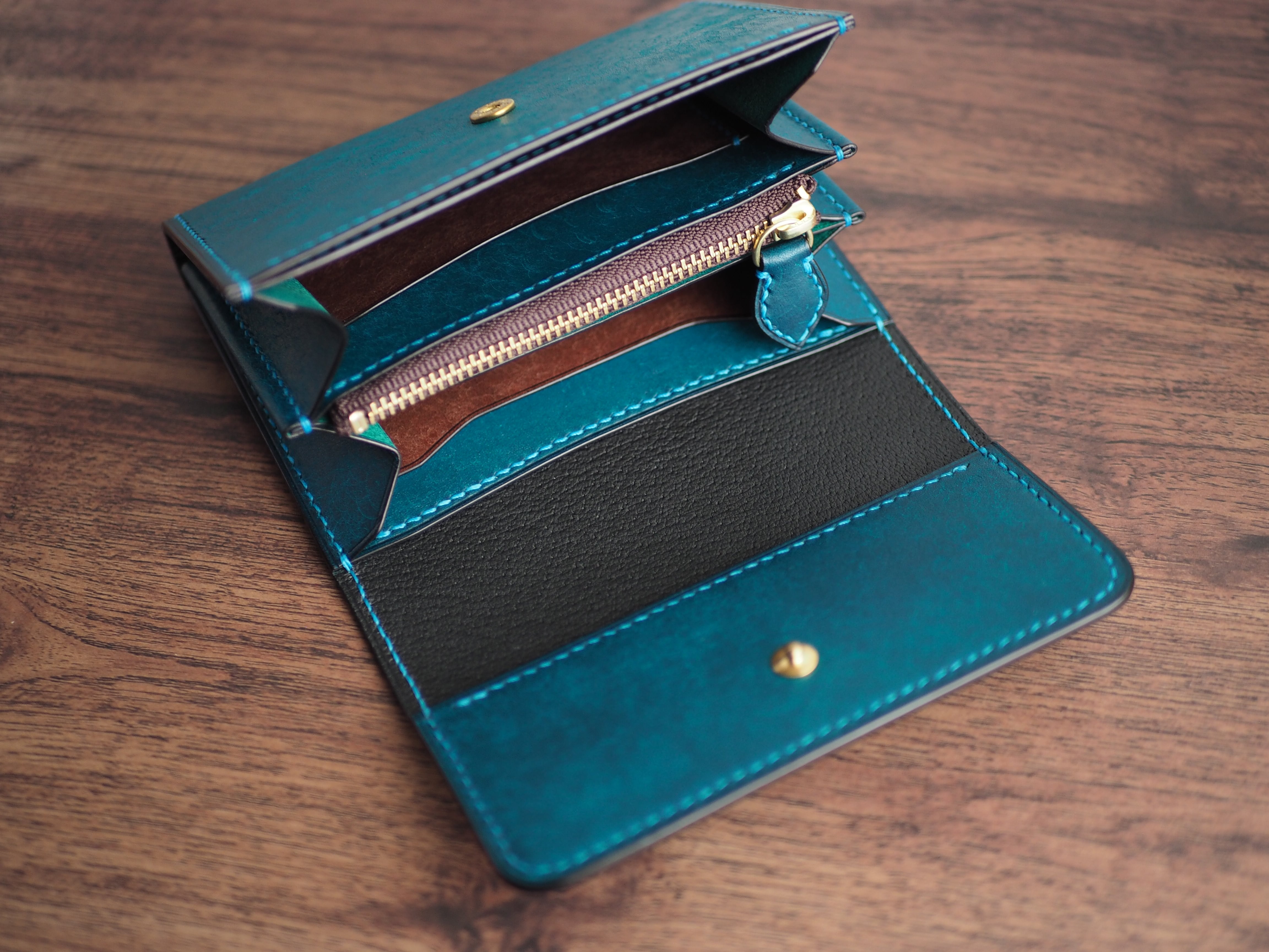 ご覧いただきありがとうございます。イタリアンレザー、マルゴーを使用したハーフウォレットになります。色はトルケーゼ(ターコイズ)とカードポケットにダークブラウンを使い、台湾製の糸、六花0.4mm(アマルフィコースト)で手縫いで仕上げています。