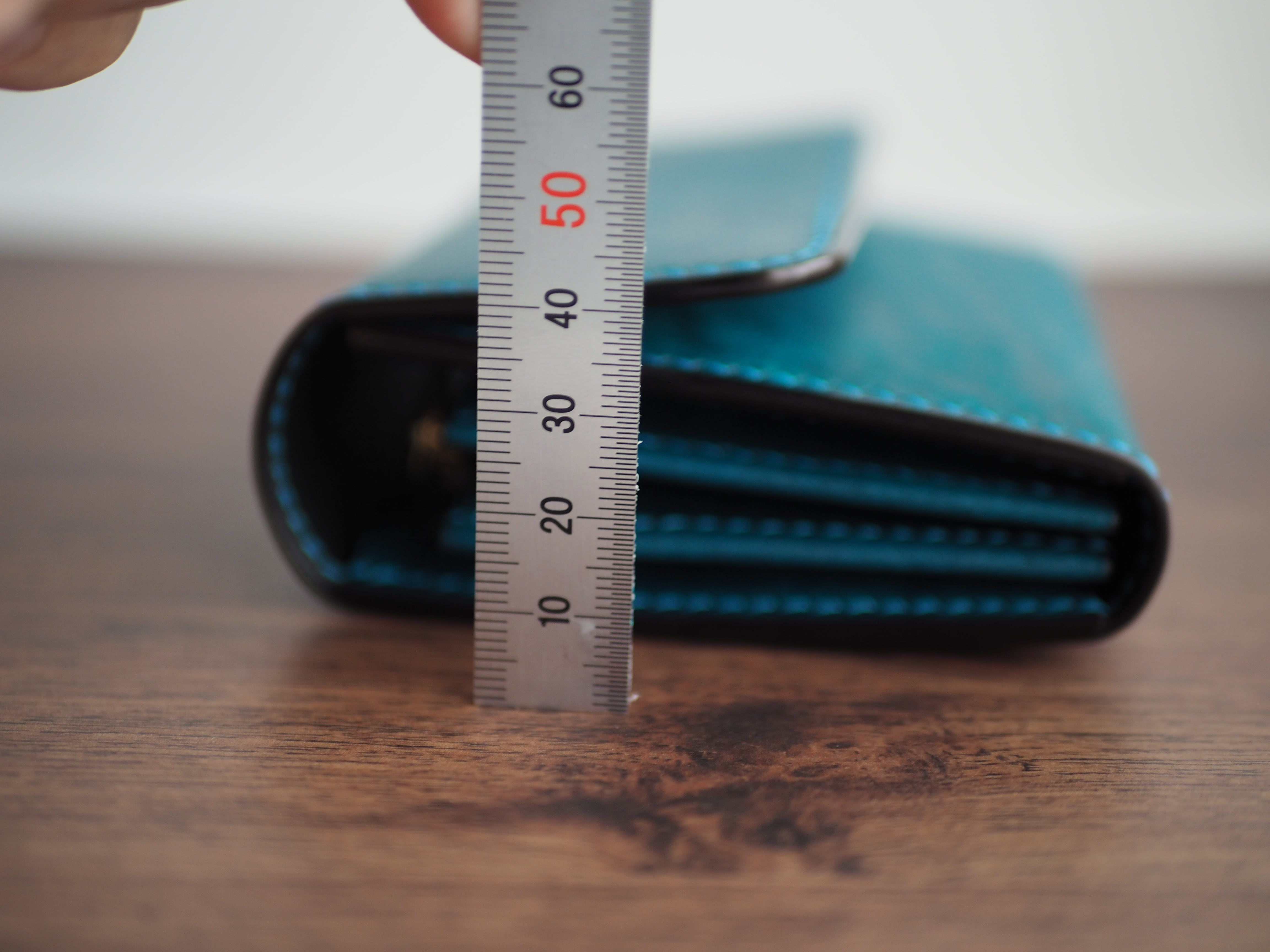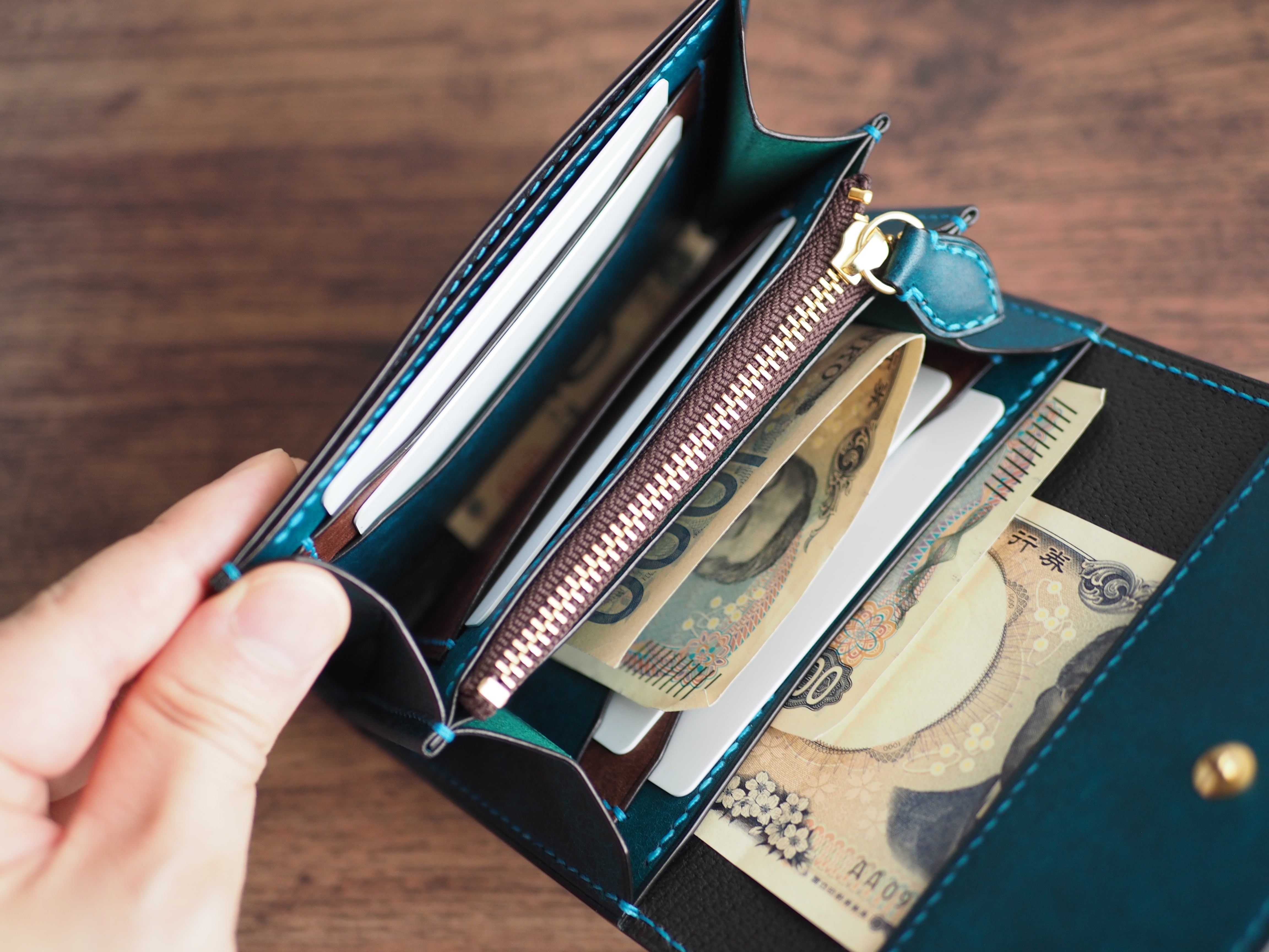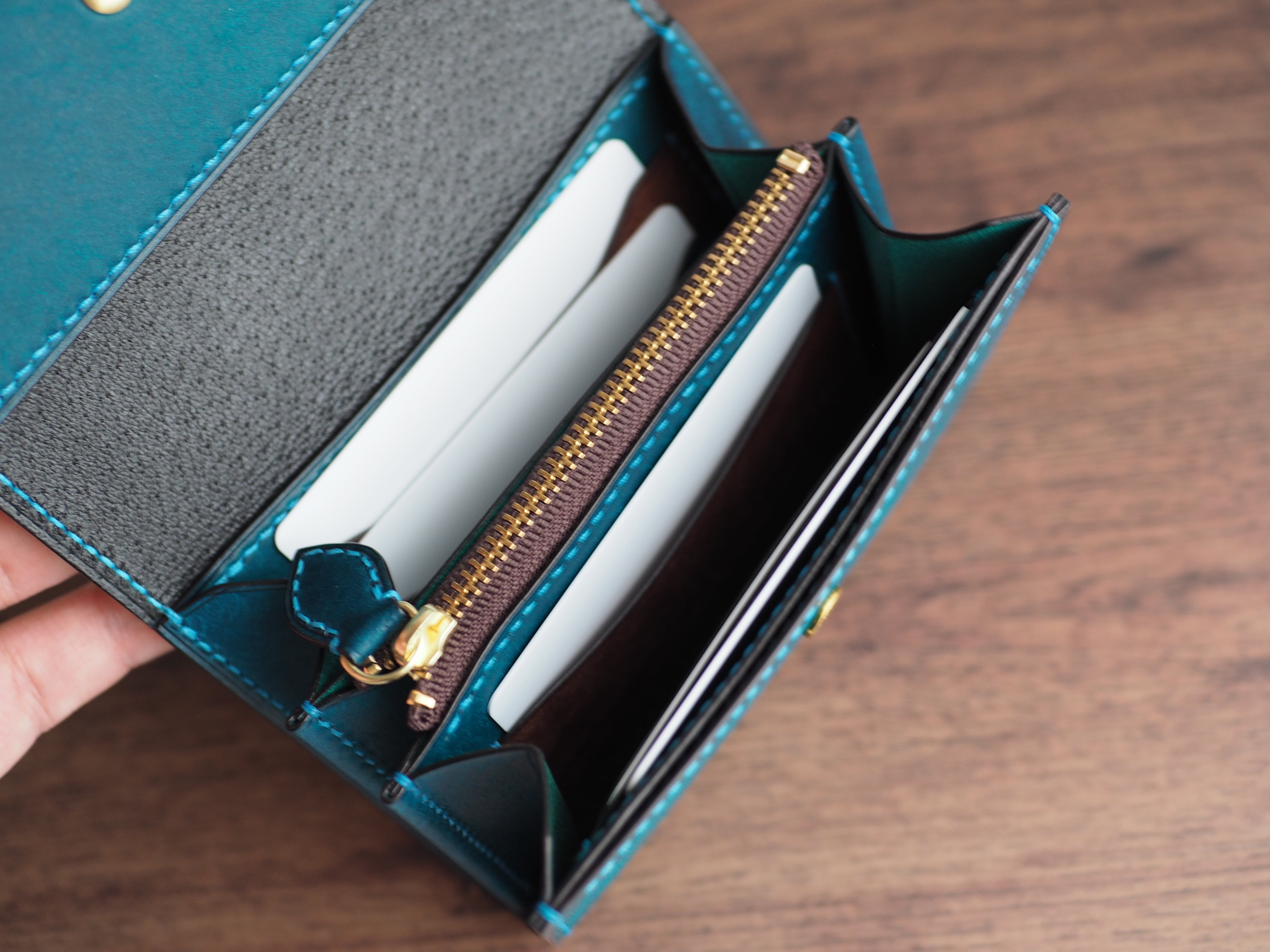 横サイズは一般的な長財布の約2/3程で縦はほぼ同程度といったところです。ふたを開ければカード、コイン、紙幣が一目で視認出来るようになっています。お札は二つ折りでマチに干渉しないように収納できます。カードポケット台座裏、かぶせ裏などにも挟み込めるようにサイズ調整しているのでお札に折り目を付けない収納も可能です。使用者のお好みに合わせた使い方が出来ます。