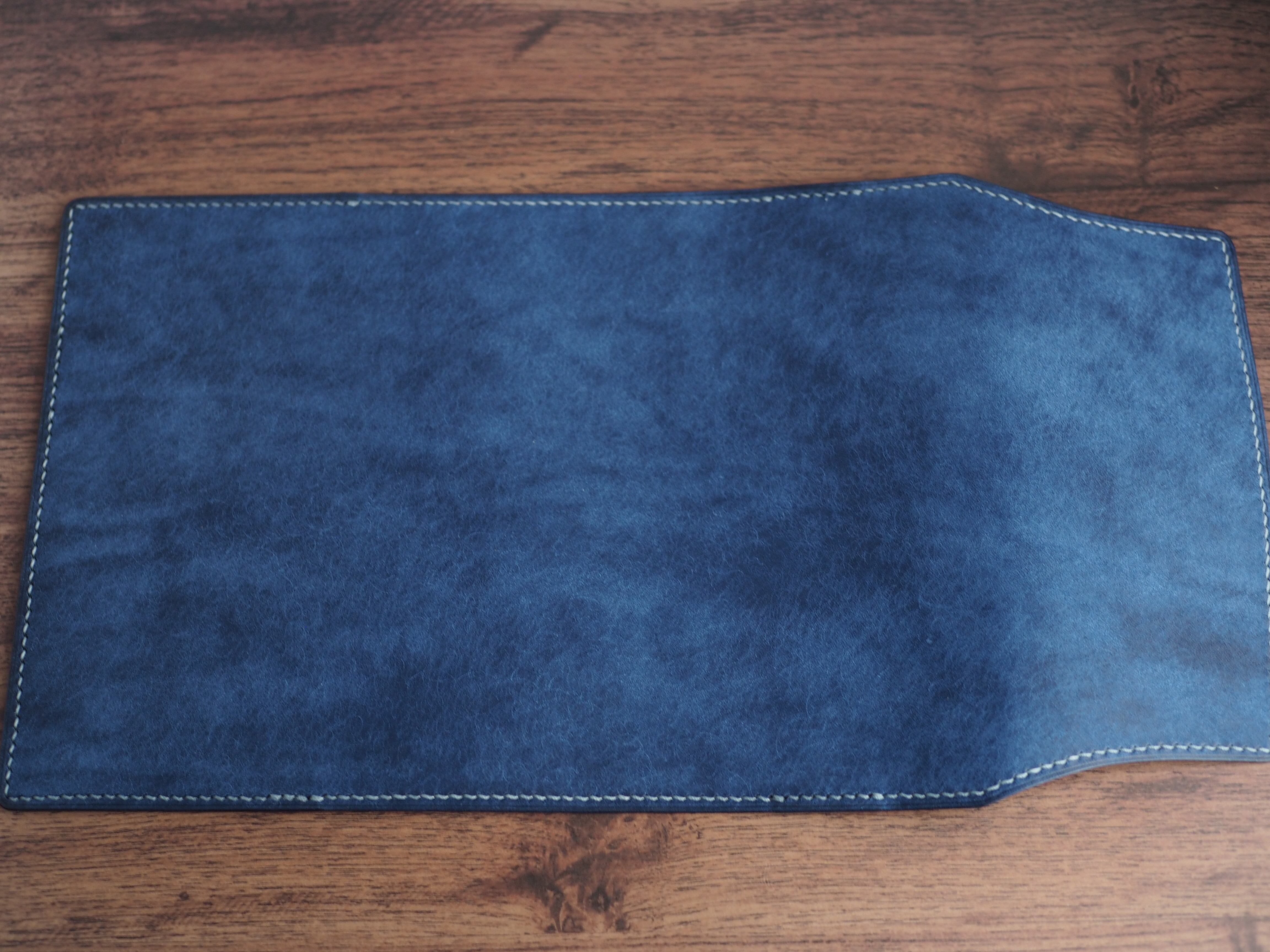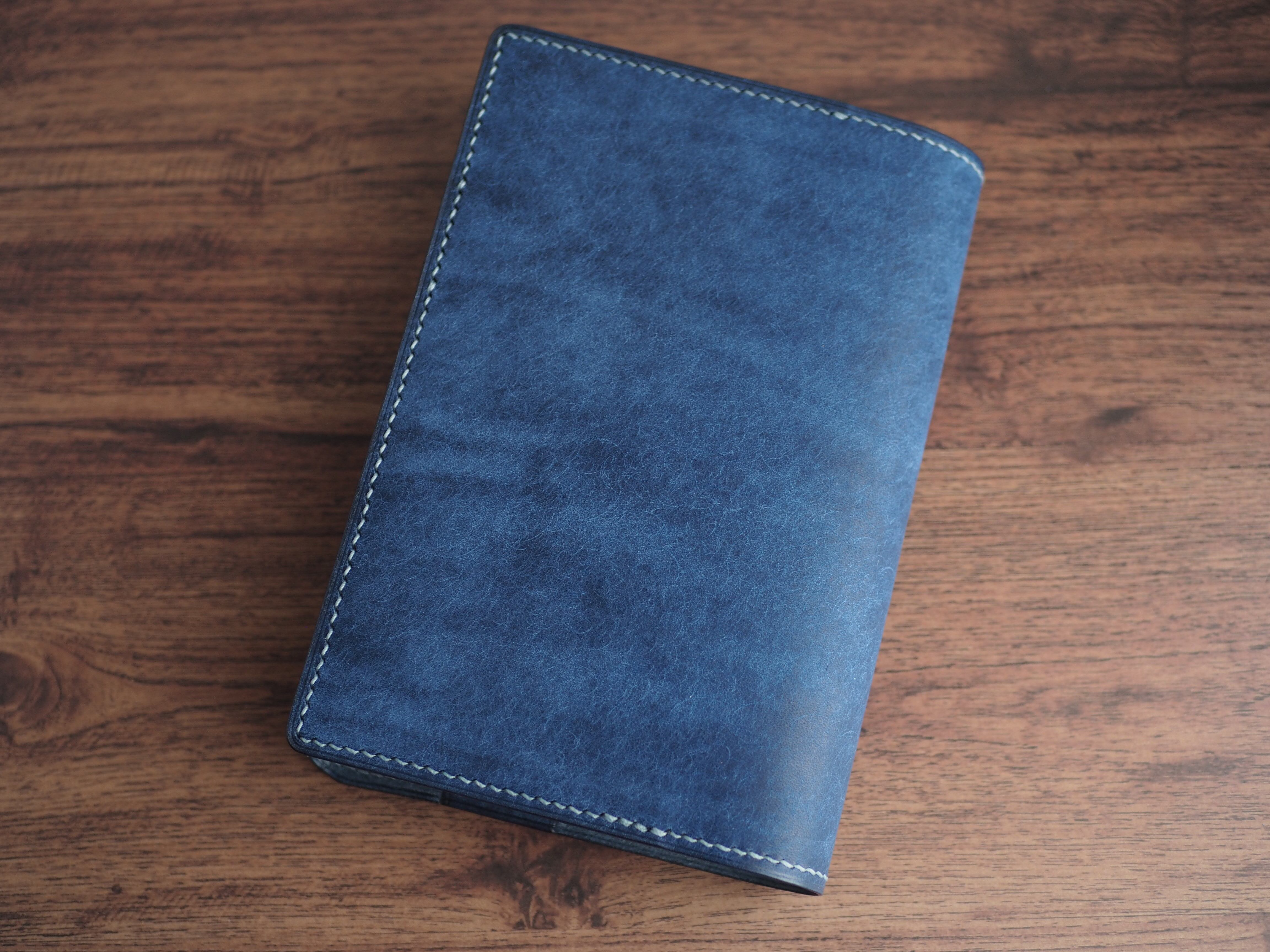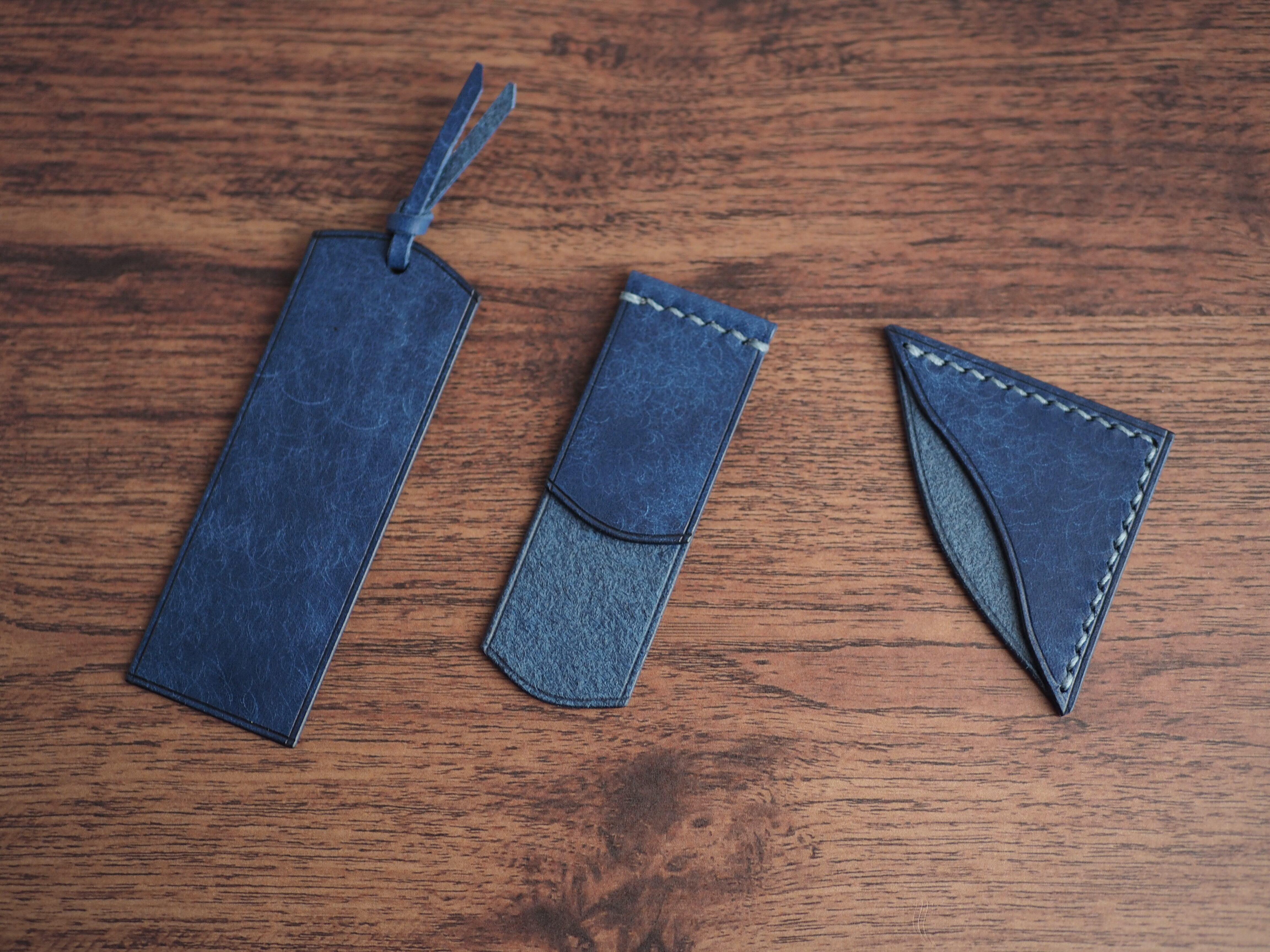 イタリアンレザーマルゴー、コバルトを使用した文庫本用のブックカバーになります。新型のハヤカワ文庫(15.6cm)は未対応です。本体備え付けの帯状のブックマークと今回は形、付ける場所の違う3種類のブックマークを付属しています。自分好みの読書スタイルを選んでいただけるようにです。初めての方にも革に触れる機会を増やそうと思い扱いやすいように設計しました。革は1ミリ前後の厚さのものを使用おり、首や肩周り、背中から切り出しています。よく動かす部位であるため革の表面にトラ(皺が虎の模様に見えるため)が入りやすい部分です。しなやかで丈夫なためお腹側に比べて強度があります。今回は革の素材感を生かすためにあえてシワ等を避けずに使用しています。こういったトラや血筋は革の魅力の一つであり、一部の方々に大変人気があります。自分好みのトラ模様を探す人、血筋の個体差を楽しむ革好きの方が増えているようです。