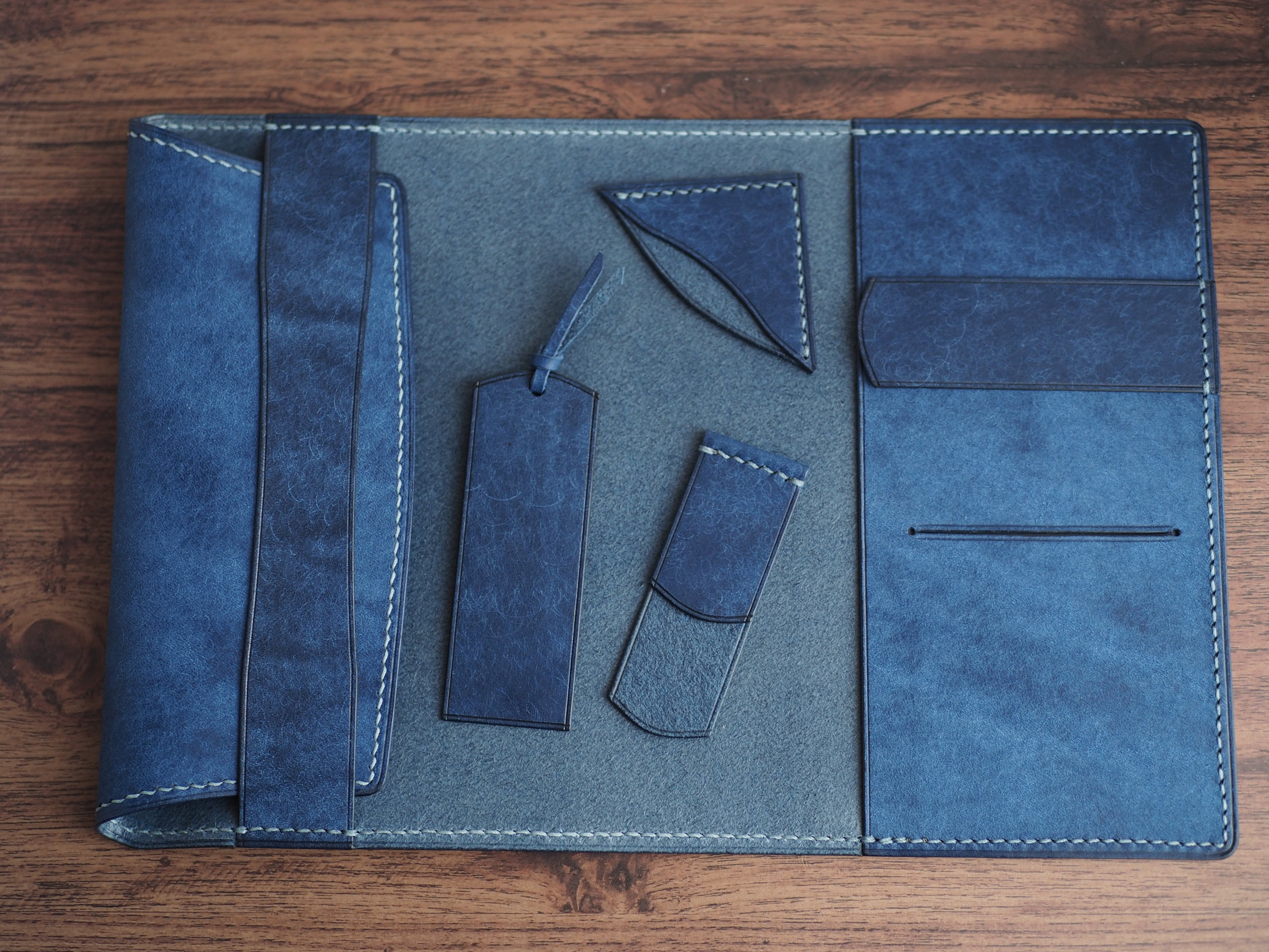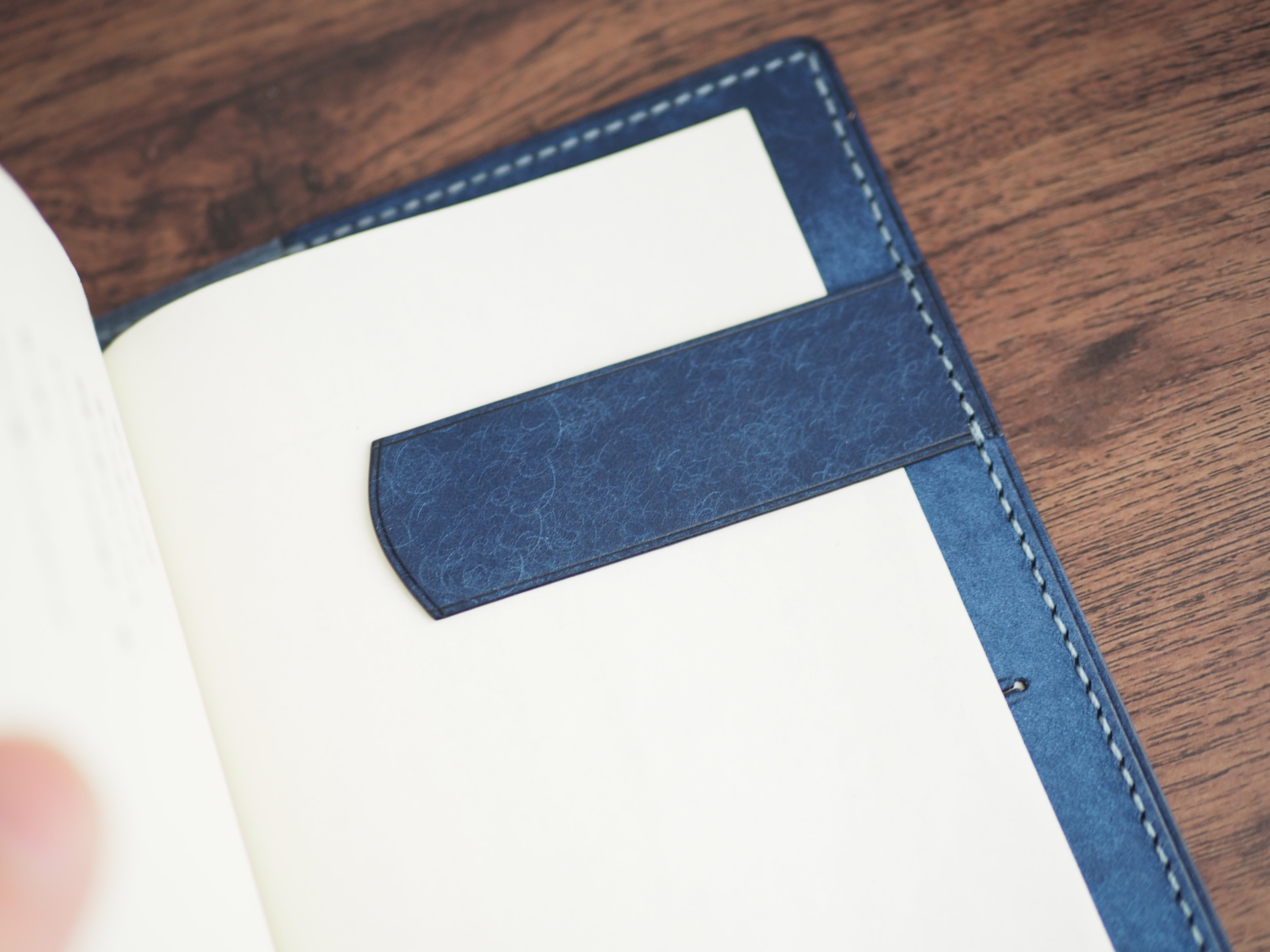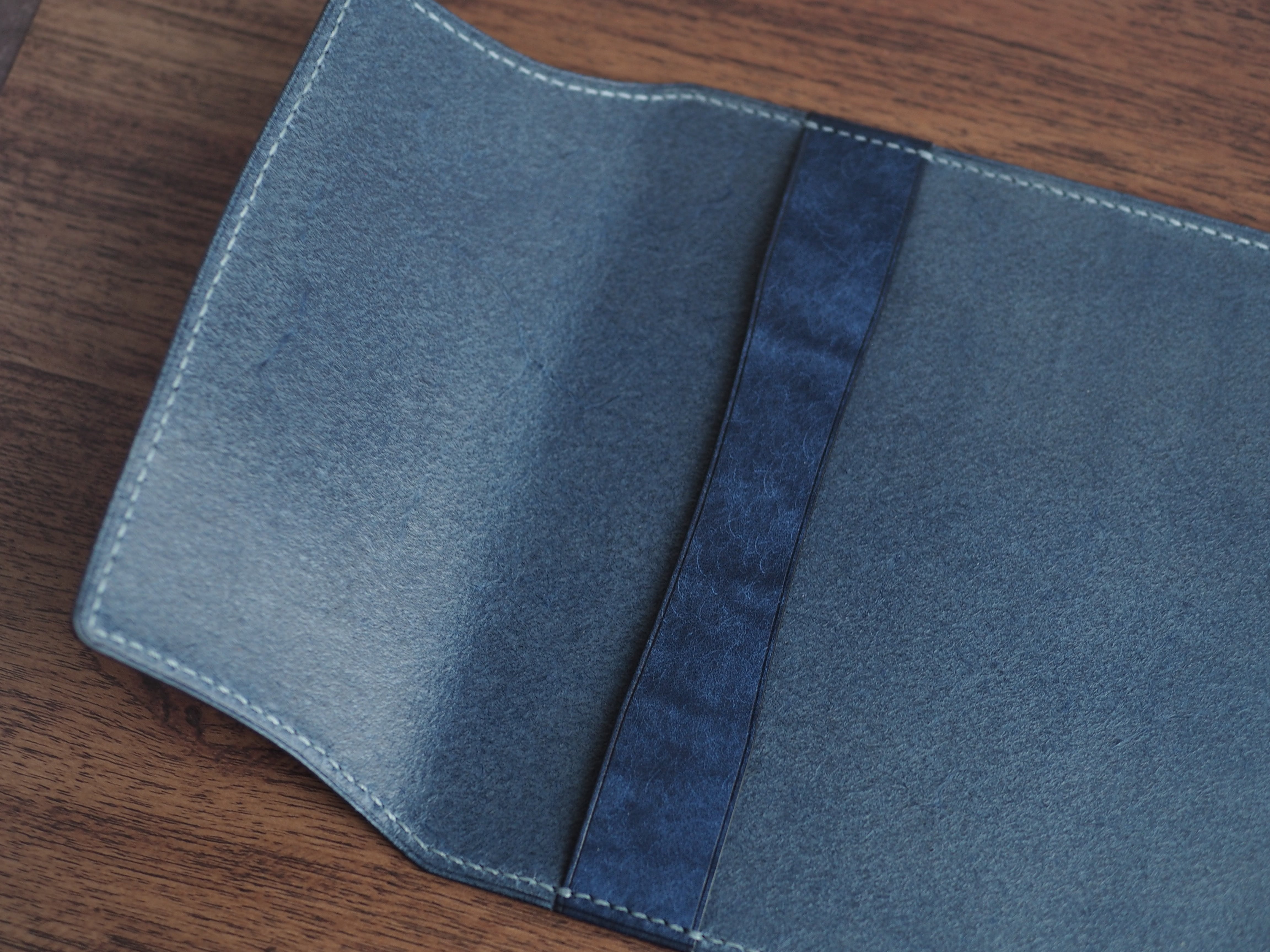 イタリアンレザーマルゴー、コバルトを使用した文庫本用のブックカバーになります。新型のハヤカワ文庫(15.6cm)は未対応です。本体備え付けの帯状のブックマークと今回は形、付ける場所の違う3種類のブックマークを付属しています。自分好みの読書スタイルを選んでいただけるようにです。初めての方にも革に触れる機会を増やそうと思い扱いやすいように設計しました。革は1ミリ前後の厚さのものを使用おり、首や肩周り、背中から切り出しています。よく動かす部位であるため革の表面にトラ(皺が虎の模様に見えるため)が入りやすい部分です。しなやかで丈夫なためお腹側に比べて強度があります。今回は革の素材感を生かすためにあえてシワ等を避けずに使用しています。こういったトラや血筋は革の魅力の一つであり、一部の方々に大変人気があります。自分好みのトラ模様を探す人、血筋の個体差を楽しむ革好きの方が増えているようです。