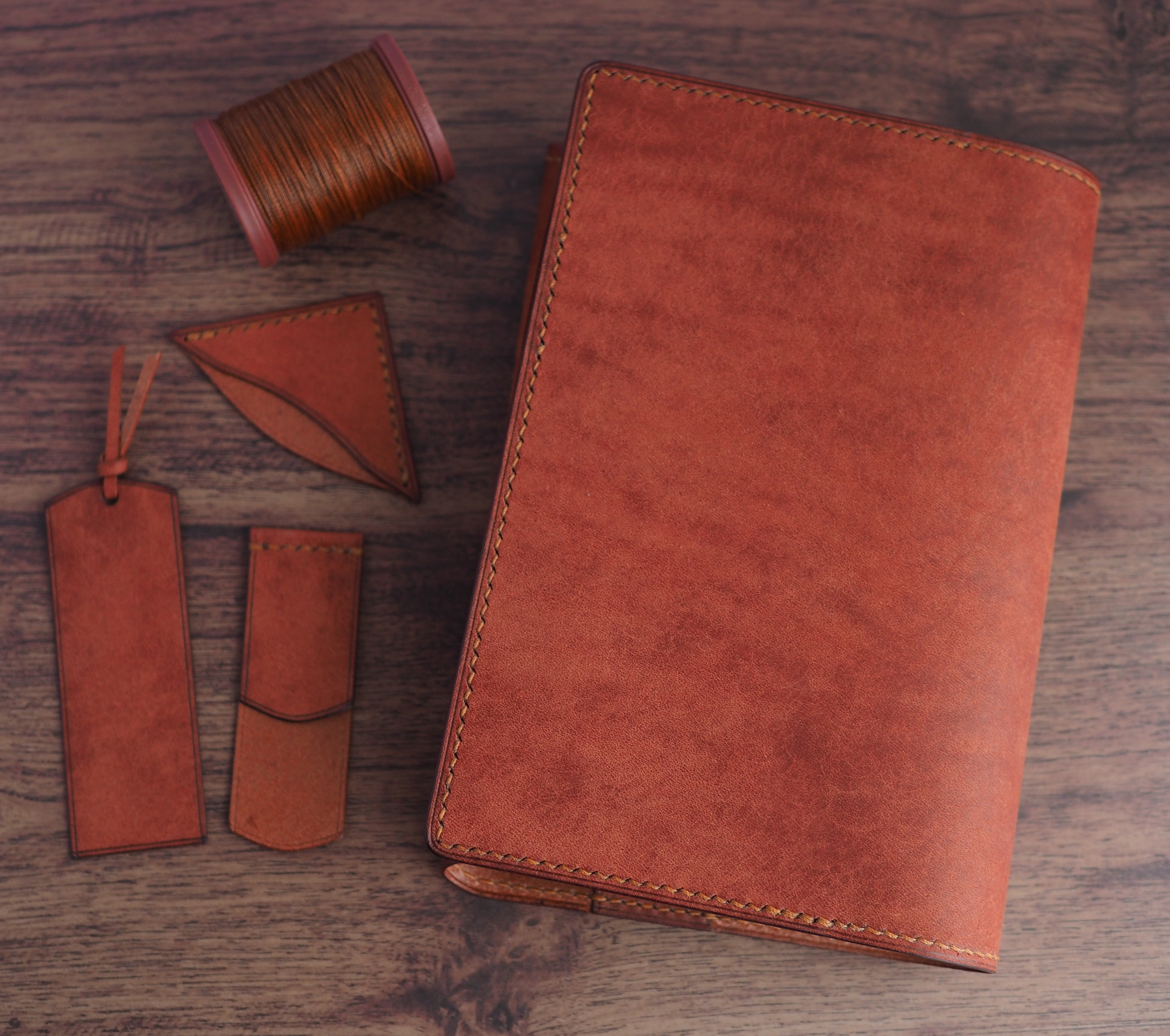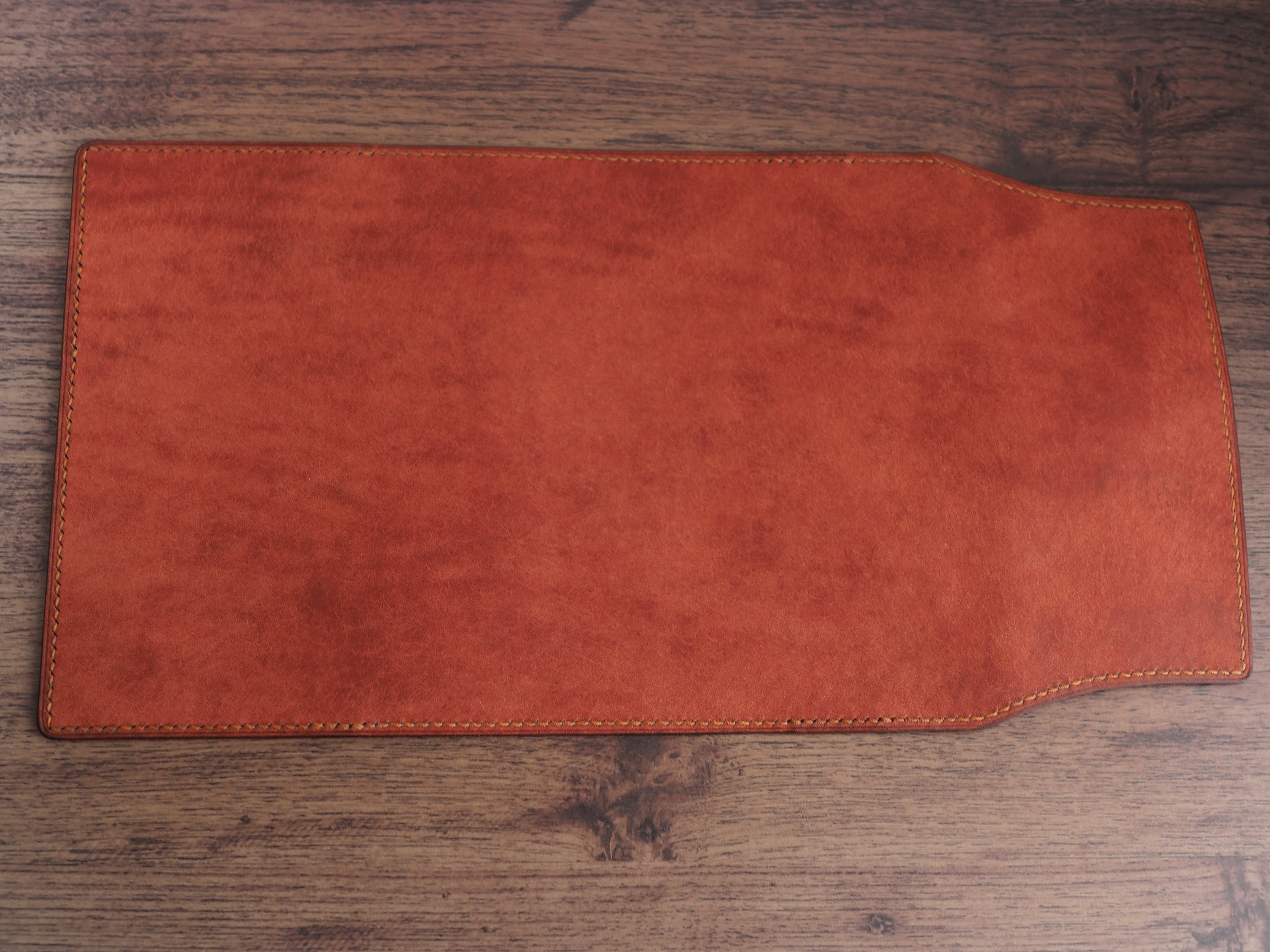 イタリアンレザーマルゴー、バーガンディを使用した文庫本用のブックカバーになります。新型のハヤカワ文庫(15.6cm)は未対応です。糸は六花0.4のトフィークランチを使用。本体備え付けの帯状のブックマークと今回は形、付ける場所の違う3種類のブックマークを付属しています。自分好みの読書スタイルを選んでいただけるようにです。初めての方にも革に触れる機会を増やそうと思い扱いやすいように設計しました。革は1ミリ前後の厚さのものを使用おり、首や肩周り、背中から切り出しています。よく動かす部位であるため革の表面にトラ(皺が虎の模様に見えるため)が入りやすい部分です。しなやかで丈夫なためお腹側に比べて強度があります。今回は革の素材感を生かすためにあえてシワ等を避けずに使用しています。こういったトラや血筋は革の魅力の一つであり、一部の方々に大変人気があります。自分好みのトラ模様を探す人、血筋の個体差を楽しむ革好きの方が増えているようです。