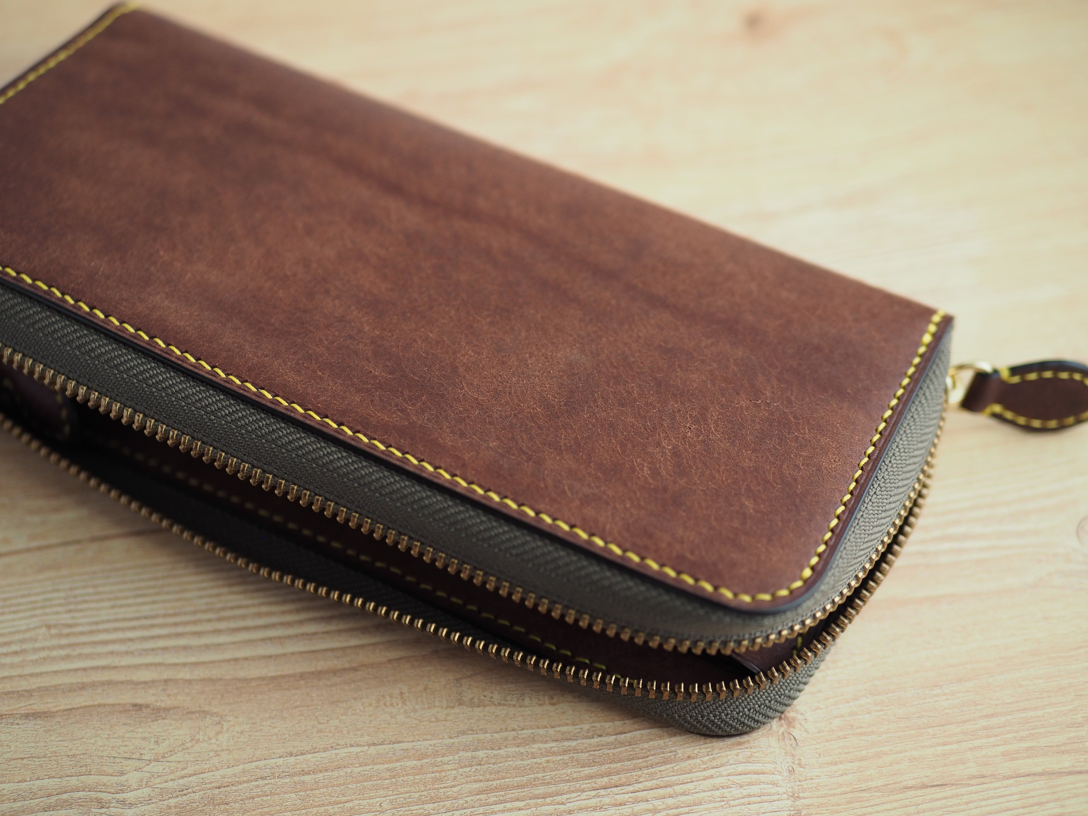 イタリアンレザーのマルゴーを使い手縫いで製作したラウンドファスナー長財布になります。